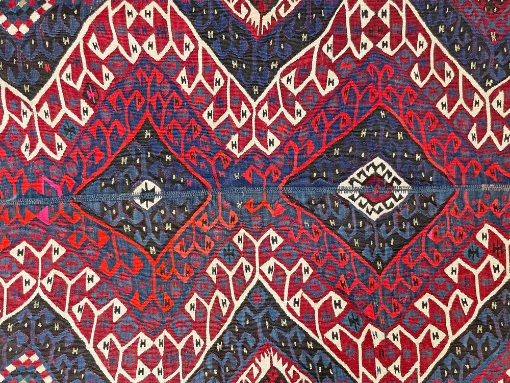 今回入荷したキリムは、トルコ東部のクルド人の多くが居住するワン地方で織られた「ワンキリム」。こちらのように大判サイズのものが多く、そのほとんどが二片以上を接いで作られ、中央から二枚はぎになっています。