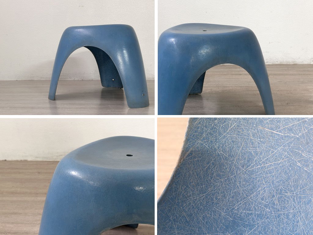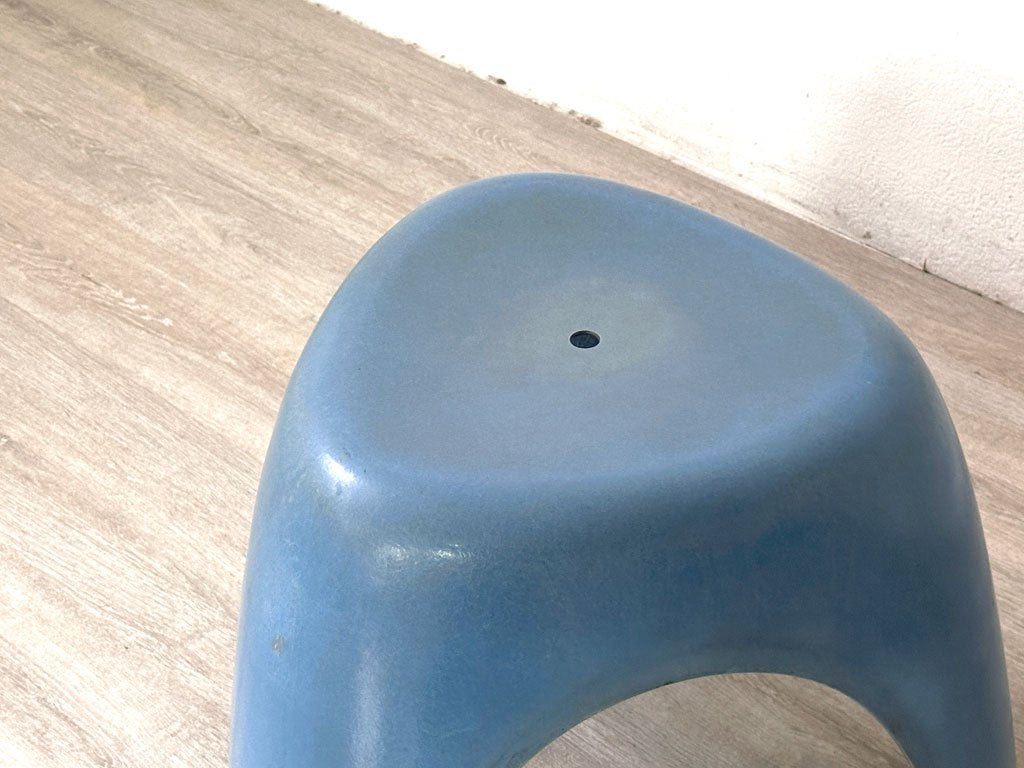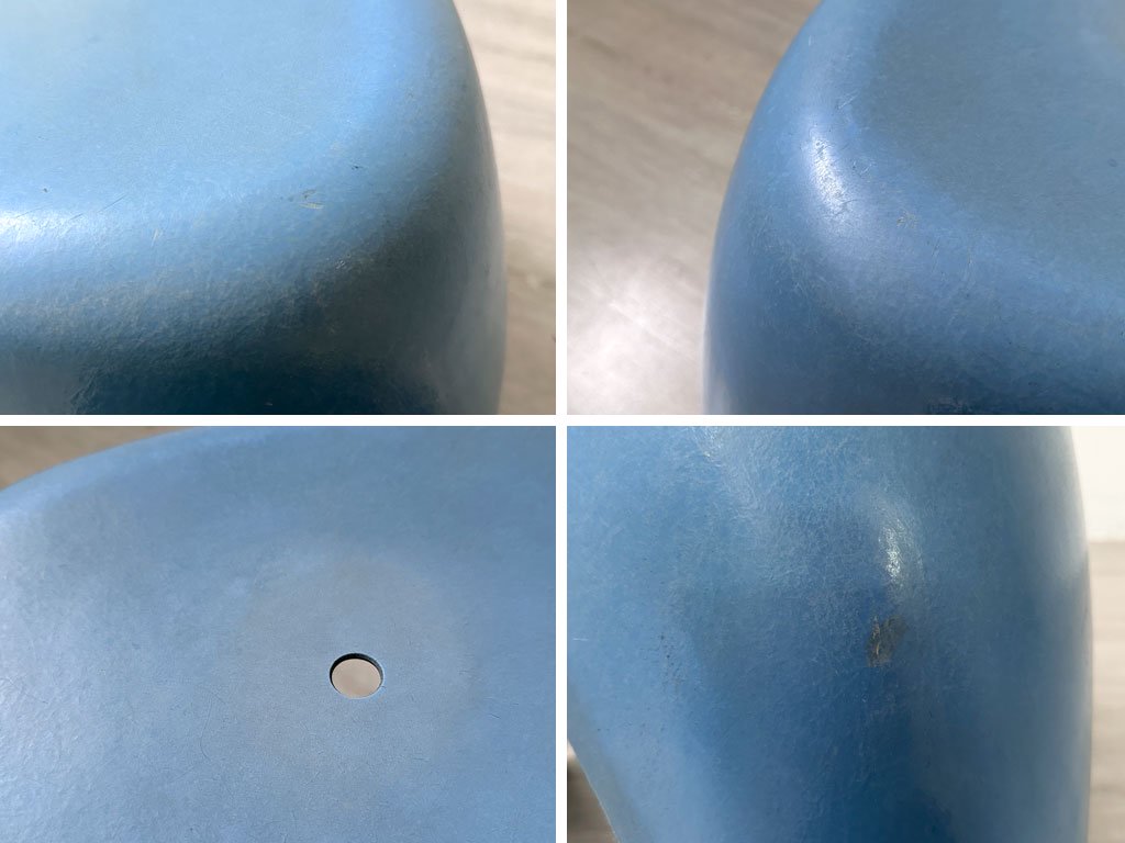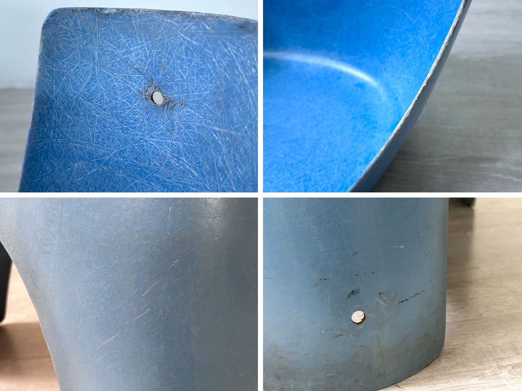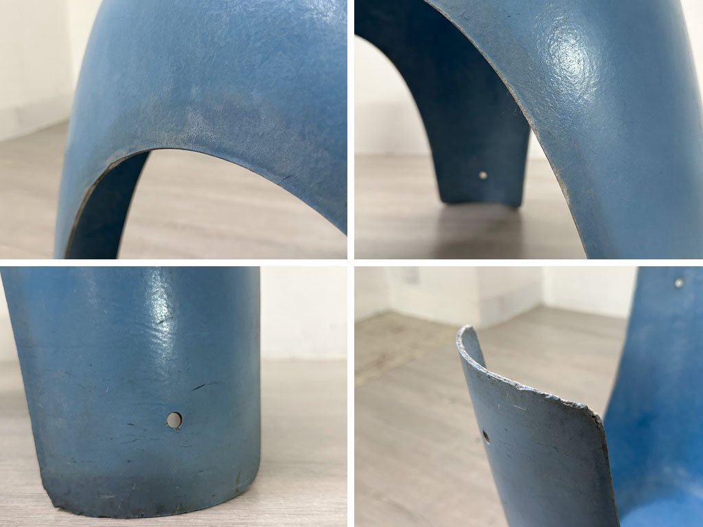 こちらはビンテージ品となります。経年に伴うスレや傷、ヤケ、取りきれない汚れや染み、色ムラ、FRP端部の擦れや、床に接する面のFRPのガリ傷など、ビンテージらしいコンディションとなっております。また屋外用に使用されていたため、座面に一か所、脚部それぞれにワイヤーを通す孔が開けられております。脚部の孔の周りには塗装表面のひび割れなどもございますが、現状着座には問題ございません。