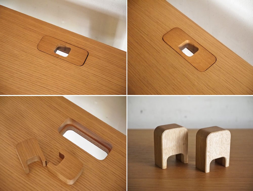 天板奥には2か所のコード孔が配置されており、木材で作られたキャップ等から細部への拘りを感じさせます。