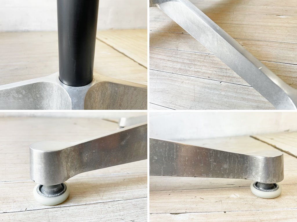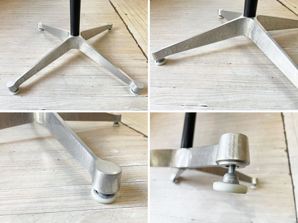 ポリッシュドアルミニウムの脚先と、ホワイトのラウンド天板、ブラック塗装された天板エッジ部分、そのすべてが綿密に計算されたバランスを保っており、組み合わせる椅子のテイストも選ばないまさにスタンダードアイテム。