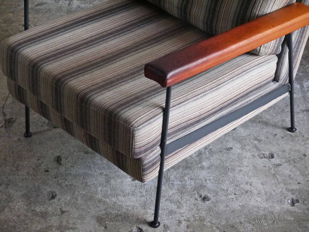 カーゴソファは華奢なスチールフレームと重厚なクッション、背面の鋲留めがレトロ且つインダストリアルな雰囲気を演出する一脚。