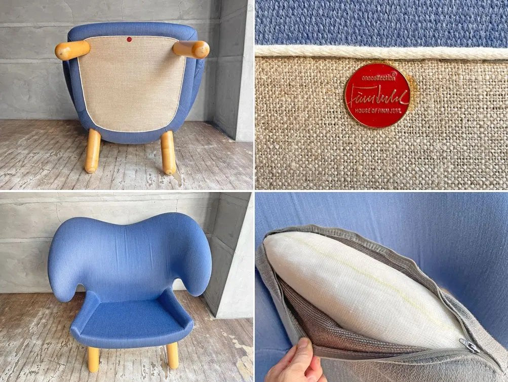 こちらは、フィン・ユール版権を所持しているonecollectionが製造し、ブルー×グレーのコンビネーションにボタンレス仕様。厚手のウールファブリックで張り上げられ、心地の良い肌触りにアールした背もたれや傾斜のある座面は快適な着座を実現しております。