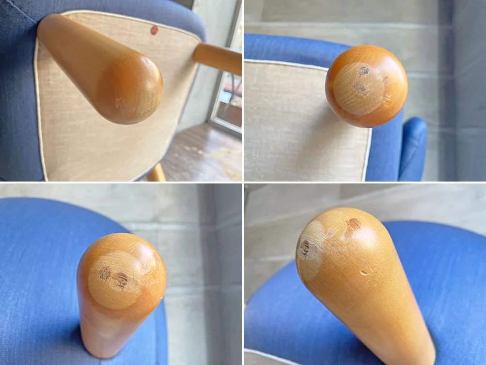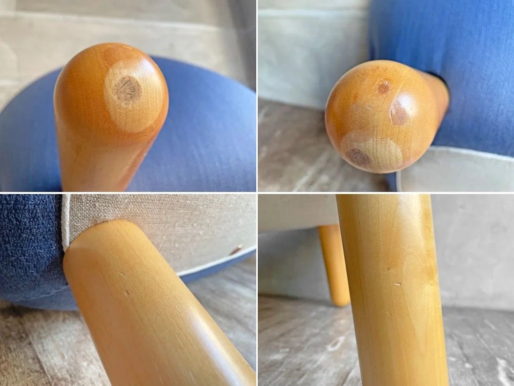 経年使用に伴う、ファブリックのスレや色褪せ、脚部に日焼けによる変色や複数の打痕が見受けられます。その他、大きく目立つダメージは無く、USED品として概ね良好なコンディションを保っております。