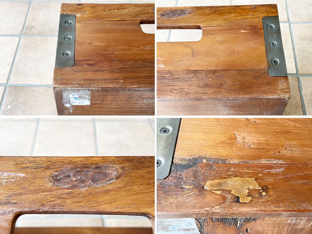 使用に伴うスレ傷や打痕、製造時のものと思われるパテ補修痕が御座いますがオールドチーク材ならではの味のある風合いとしてお楽しみ頂けるかと思います。使用に問題となるような著しいダメージはなく、これからも気持ちよくお使い頂けるコンディションとなっております。