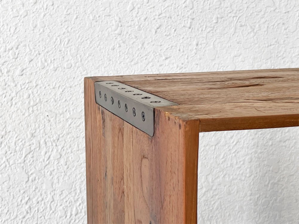 チーク古材特有の色ムラや手触りを活かしたウッドフレームにブラック色の金属フレームを組み合わせ、程よく全体を引き締めるメリハリの効いた造り。