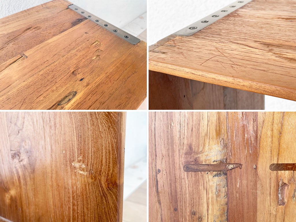使用に伴うスレ傷や打痕、製造時のものと思われるパテ補修痕が御座いますがオールドチーク材ならではの味のある風合いとしてお楽しみ頂けるかと思います。使用に問題となるような著しいダメージはなく、これからも気持ちよくお使い頂けるコンディションとなっております。