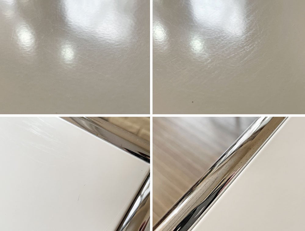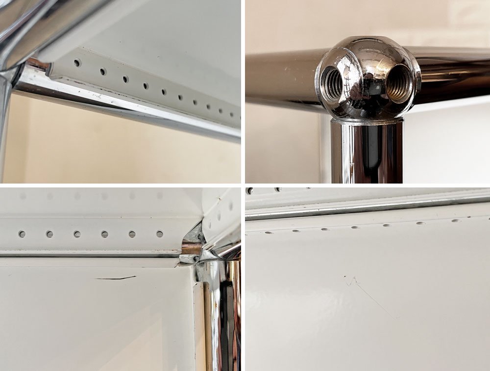 フレームにはくすみや小傷が見受けられるほか、棚板の角を中心に塗装剥がれに伴い錆が生じている箇所がございます。また、一部目立った線傷が数か所確認できるとともに、全体に擦れや傷、取り切れない汚れ等がございますが、ご使用に支障となるダメージはございません。今後も安心して実用頂けるコンディションを保っております。