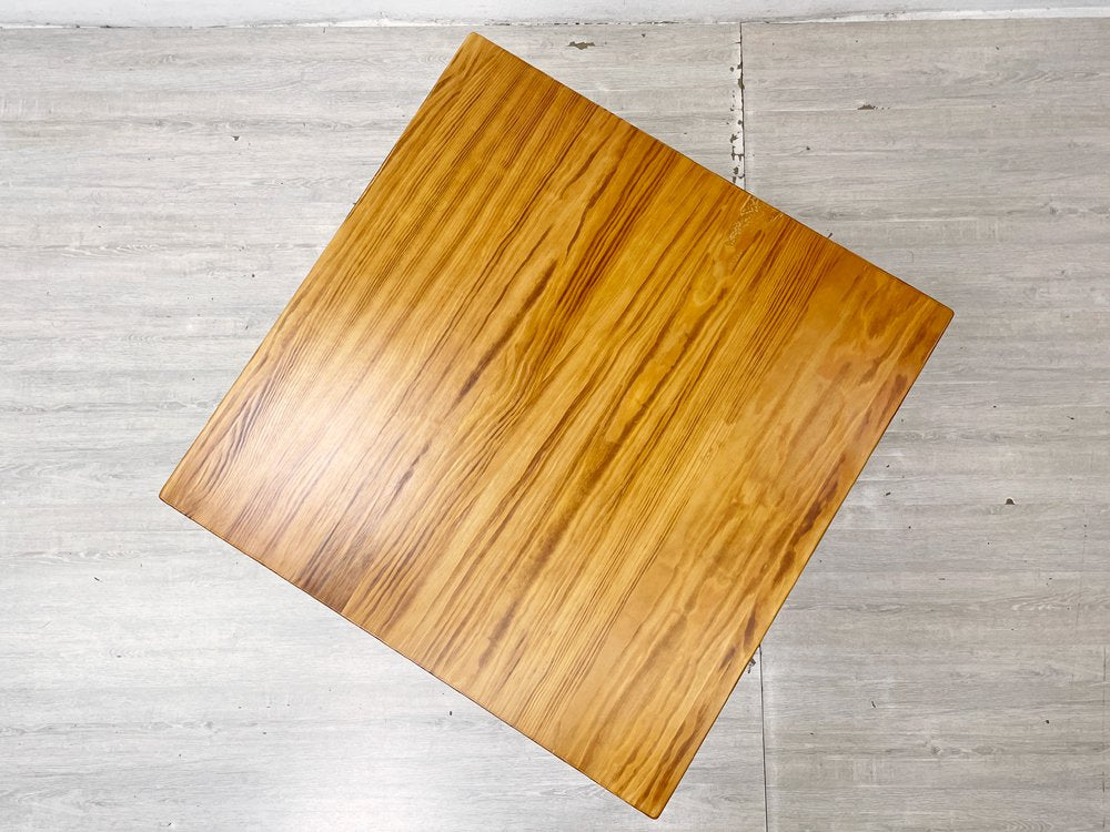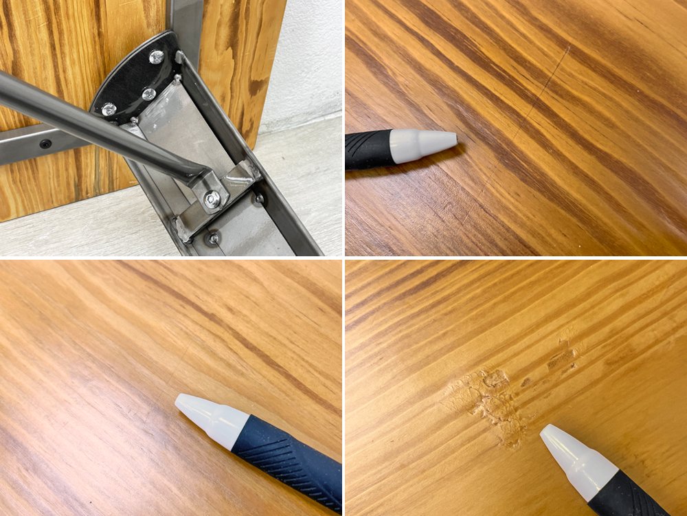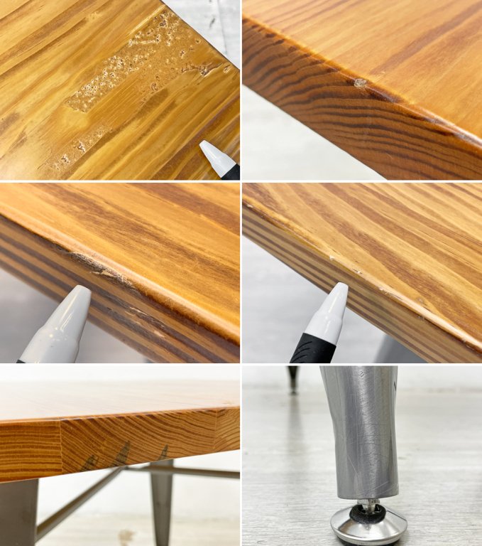 使用に伴う細かな擦れ傷や薄っすらとした線傷、打痕等はございますが、いずれも大きく目立つものではございません。また木の節目や凹凸、脚部には塗装表面のヒビ等はございますがこちらは製造時のものとなります。テーブルを傾けた際、まれにフレームの空洞内部にカラカラといった音が鳴る場合があり、設置箇所によってはわずかにカタつきが感じられる場合がございますが、脚部アジャスターやフェルト等を活用する事で今後とも気持ち良くお使い頂ける、USED品として概ね良好なコンディションを保っております。