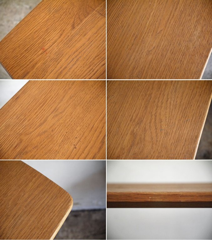 使用に伴い、天板に細かな擦れや傷、ペイント汚れ、くすみ、縁や脚部に小さな打痕が見受けられます。