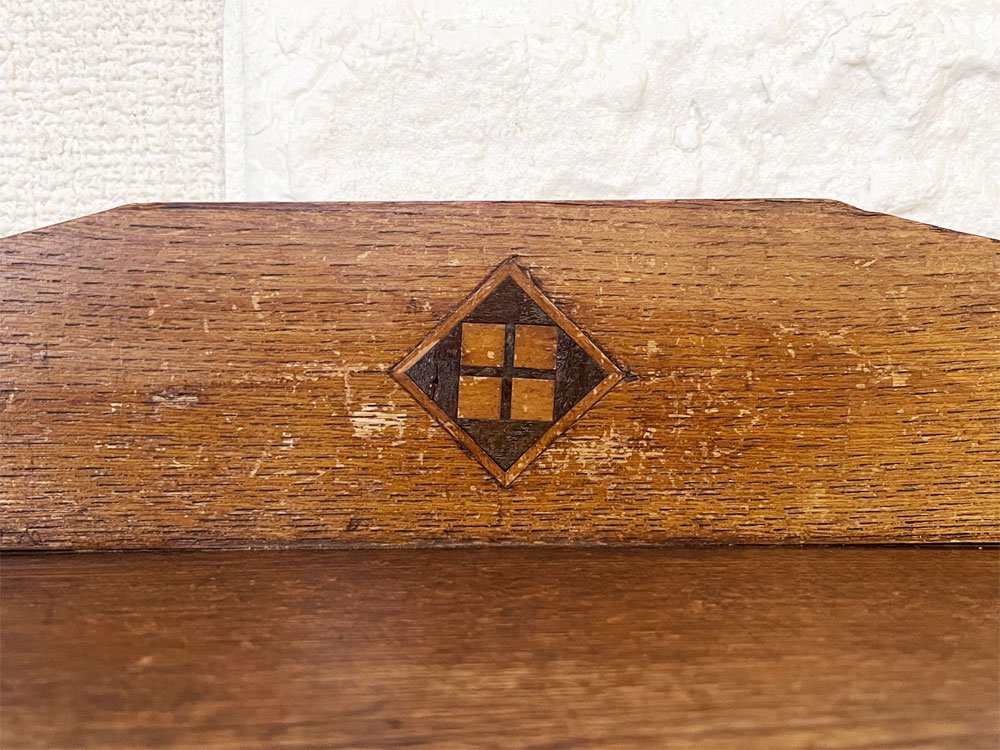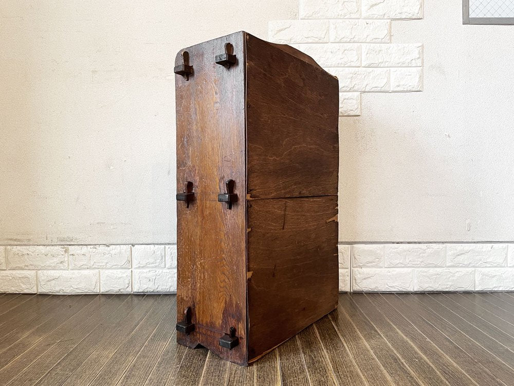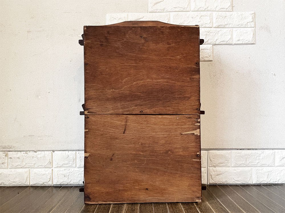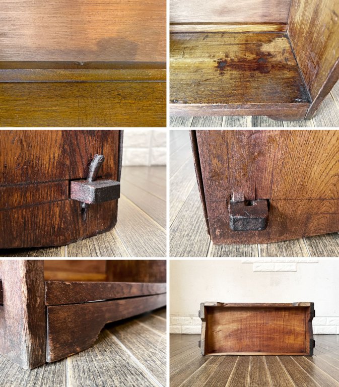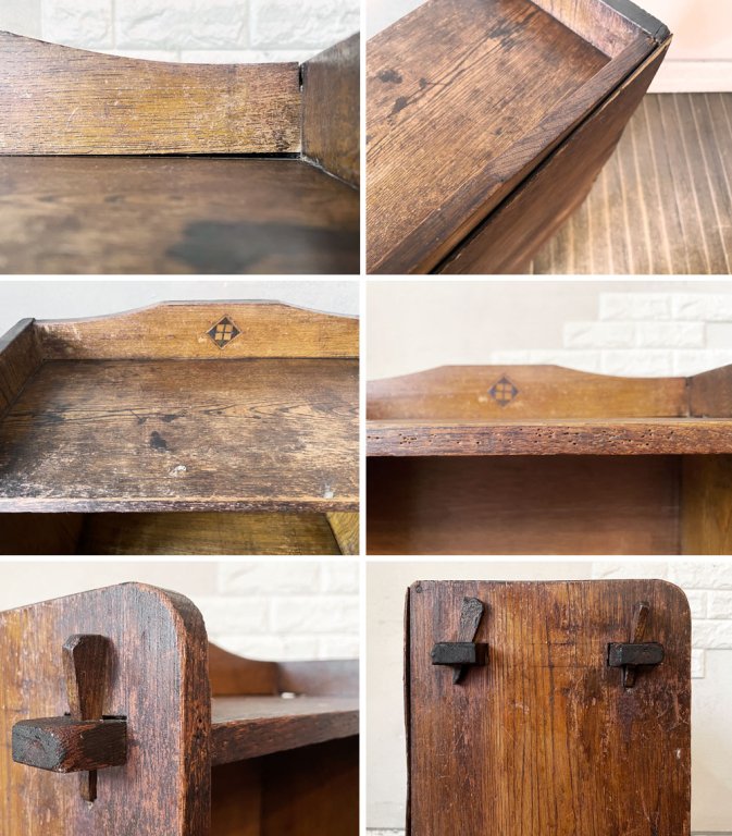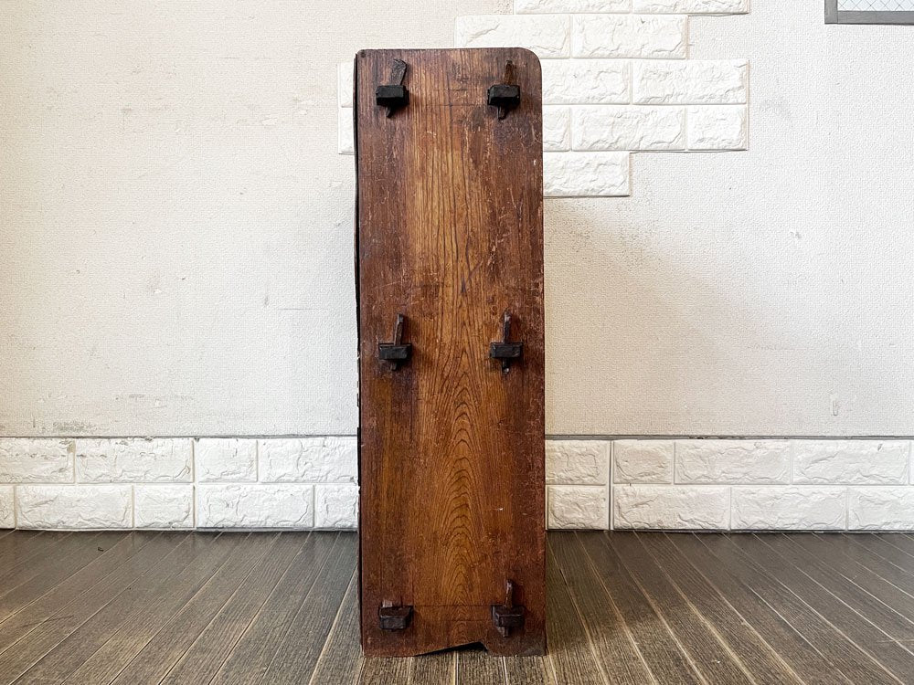こちらは、ビンテージのお品物です。全体に擦れや傷、縁の削れ、木色のムラ、虫食い穴、シミなどの取り切れない汚れ等が散見されます。また、背板の膨張により隙間が生じている箇所が複数確認できます。その他、背板を中心に板の剥がれやささくれが見受けられるほか、楔は欠品箇所や抜き差し不可の箇所、枝のようなパーツに取り替えられている箇所がございます。なお、正面最下段部の飾りパーツに若干の緩みがございますが、設置時にはがたつきやぐらつきなどはございません。経年の風合いをお楽しみいただきながら実用頂けるコンディションを保っております。