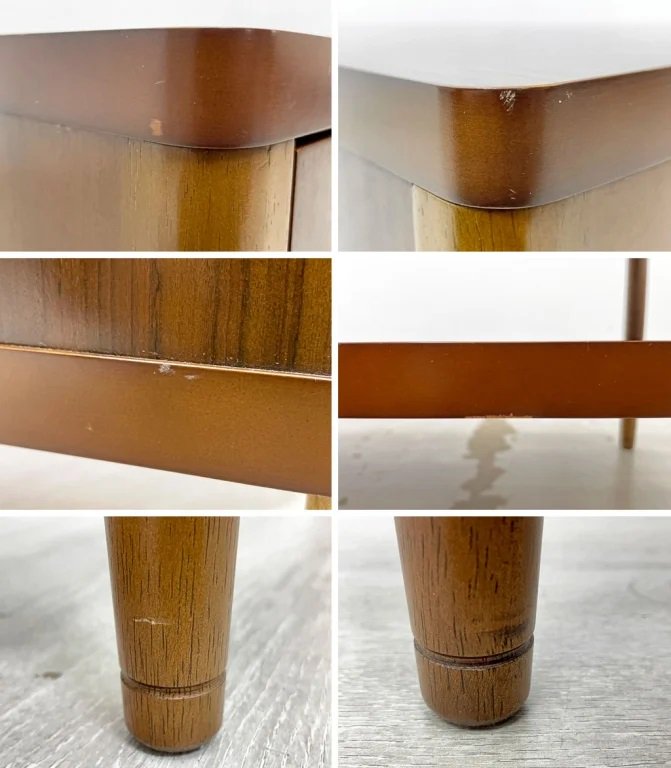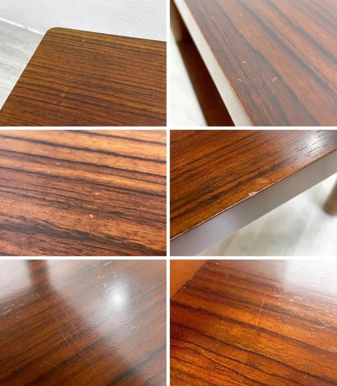使用に伴う軽微な擦れや打痕、傷、落としきれない汚れが各所に散見されます。天板の左端には日焼けによる色合いの変化が若干感じられますが、その他美観や使用に問題となるダメージは見られず、比較的良好なコンディションを保っております。