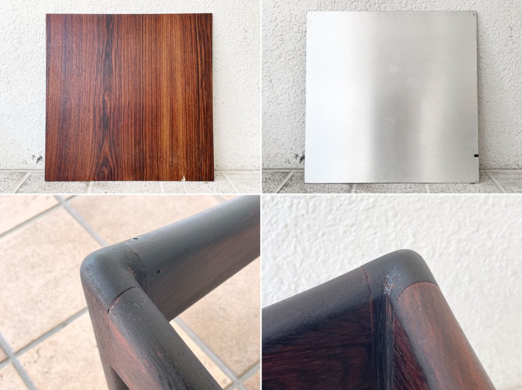フレーム角には僅かな窪みが設けられており、ガラス天板をそのままセットする事が可能。また木製に見える天板下の棚板は、実はステンレスと見られる金属製の板にローズウッドの突板を貼り合わせたものであり、このような個性的な仕様も大きな魅力ではないでしょうか。2枚の板はそれぞれ取り外しが可能な為、気分やお好みに合わせてお使い頂けます。