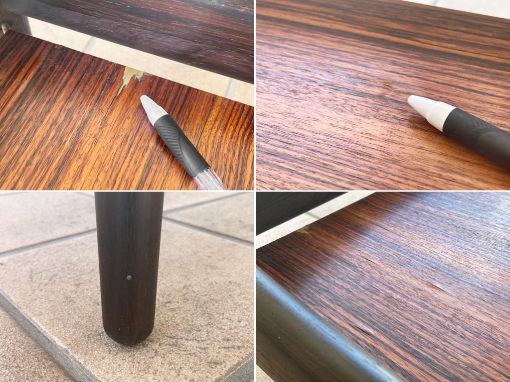 こちらはビンテージ品です。フレームには経年なりの擦れや細かな傷、接合部び僅かな隙間等がございますが、ビンテージ品特有の味としてお楽しみ頂けます。ガラス天板に光の加減で見える程度の擦れ、棚板表面には突板の剥がれと補修跡が一か所、その他僅かに突板の凹凸が見られますが、こちらも大きく美観を損ねるものではございません。ガタツキや割れ等使用上問題となるダメージも無く、ビンテージ品としましては概ね良好なコンディションを保っております。