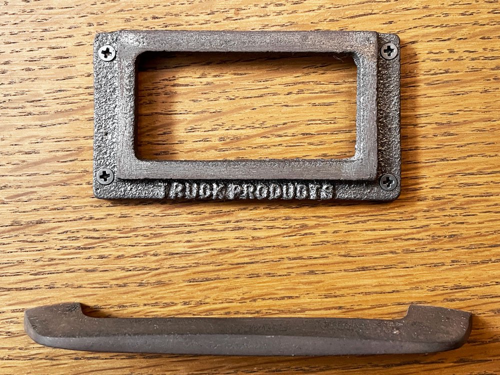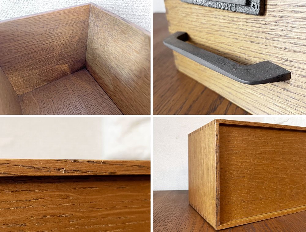 楢材の板を丁寧にあられ組みし、前面に鋳鉄製のネームプレートと把手があしらわれたシンプルながら重厚感のあるデザインが魅力です。