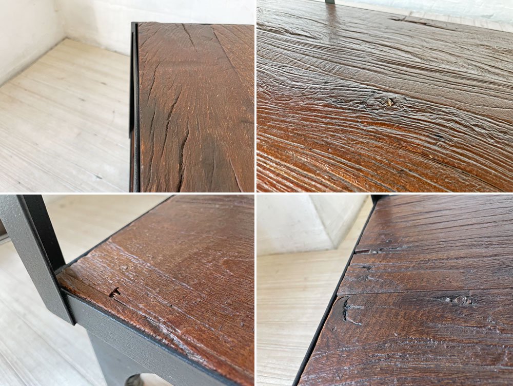 天板にはニレ古材を使用し、木の割れや節などの経年による自然の風合いを楽しめる造り。対してブラック色塗装が施されたスチールフレームが、全体の印象を引き締め、シックで大人びた空間演出をお楽しみ頂けます。