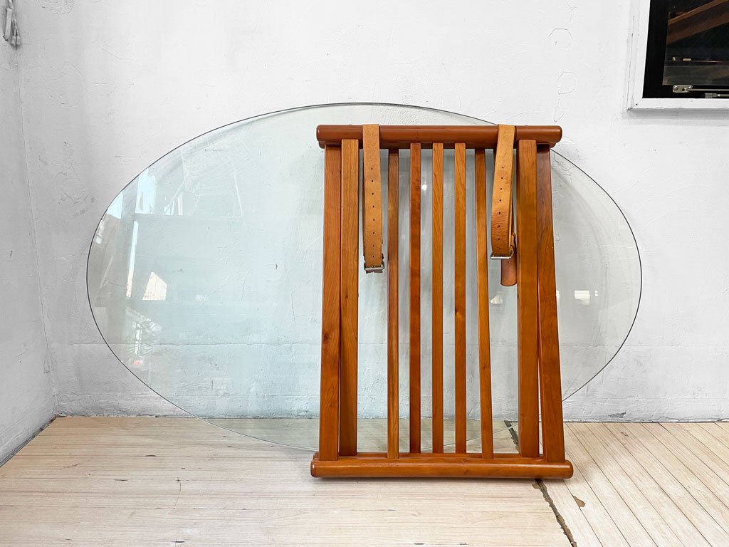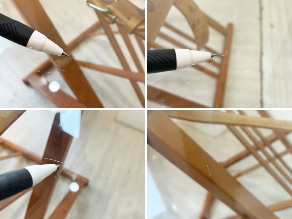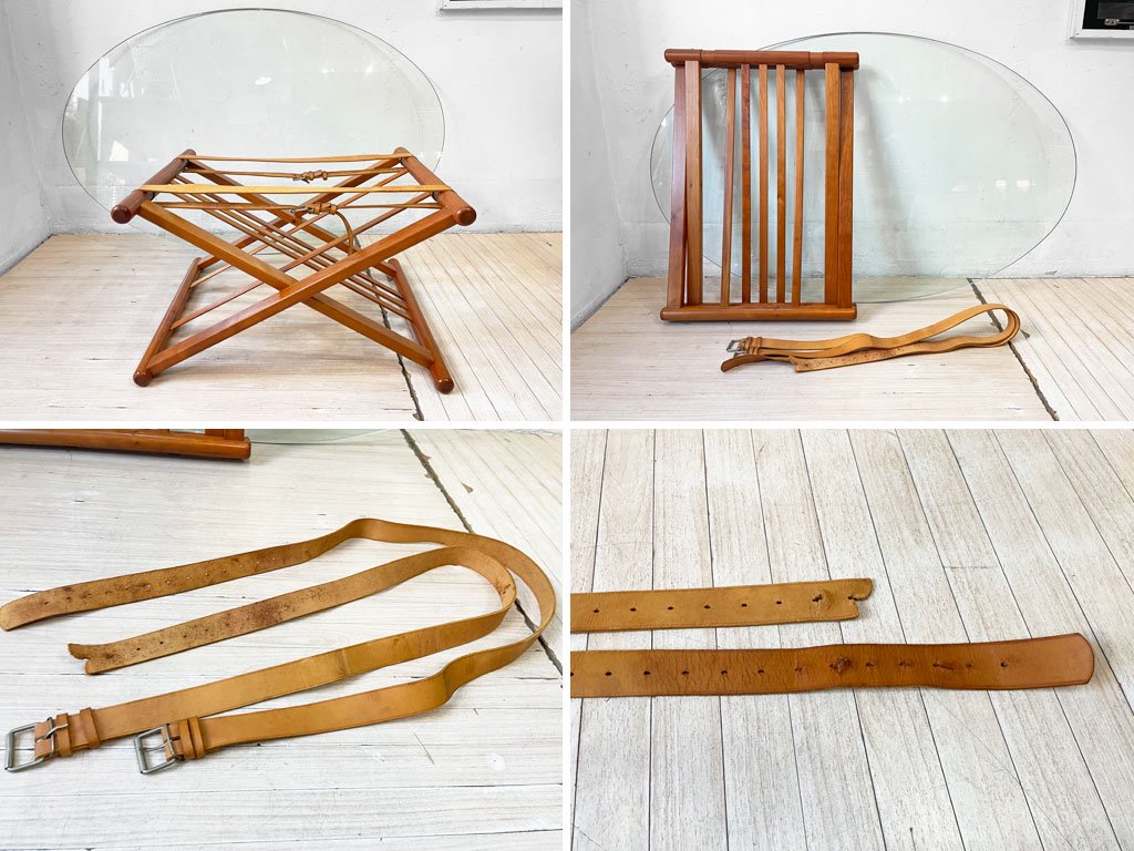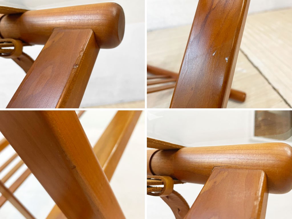 使用に伴い、ガラス天板に複数の線傷、フレームには傷や擦れ、打痕や色ムラ、接合部の僅かな遊びや亀裂、革ベルトにはシミや色むら、片側のベルトの切れやベルト穴の広がりといったダメージが見上けられますが、強度に問題はございません。その他、使用に問題となるような大きなダメージは無く、これからも安心してご使用頂けるコンディションを保っております。