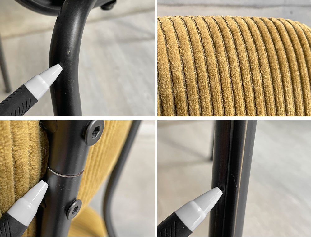 使用に伴い背もたれ・座面共にコーデュロイ生地のへたりや潰れ、毛羽立ちが見受けられます。フレーム部分には軽微な擦れ等の小傷がございますが大きく目立つものではありません。その他グラつきなどご使用頂く上で問題となるような大きなダメージは無く、これからも実用頂けるコンディションを保っております。