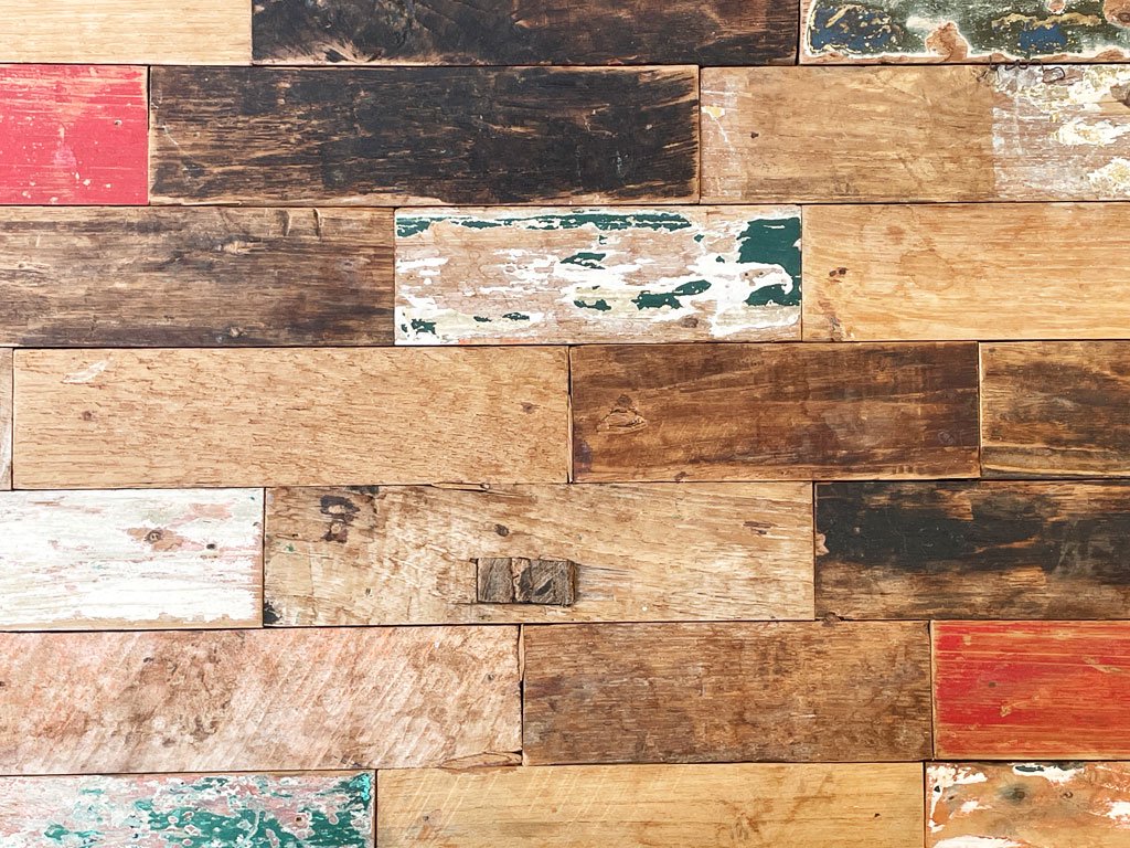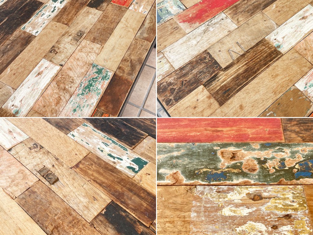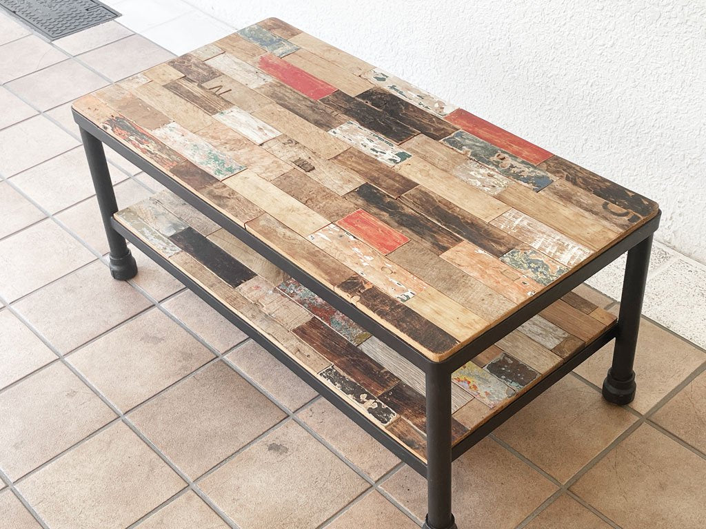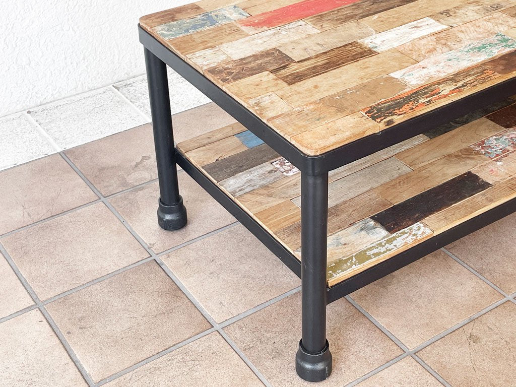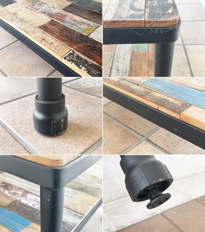 天板と棚板には、建材や船舶などに実際使用されていたチーク古材を使用。ランダムに入るペイント、古材ならではのやれた風合いが大きな魅力となっています。