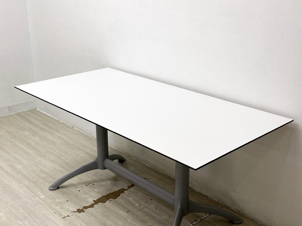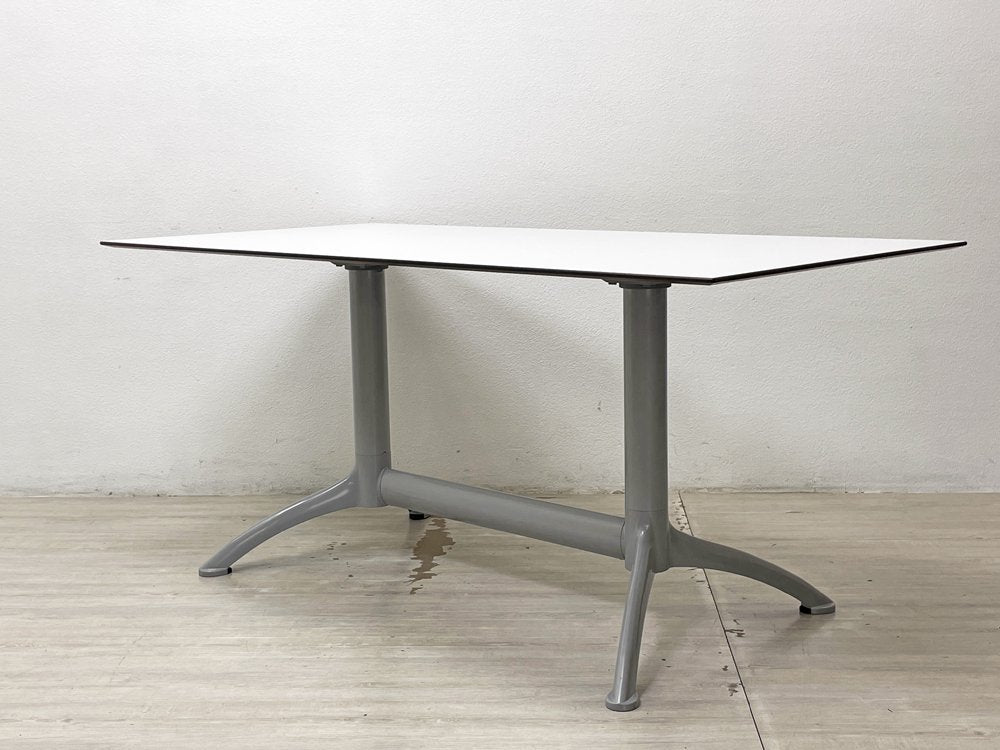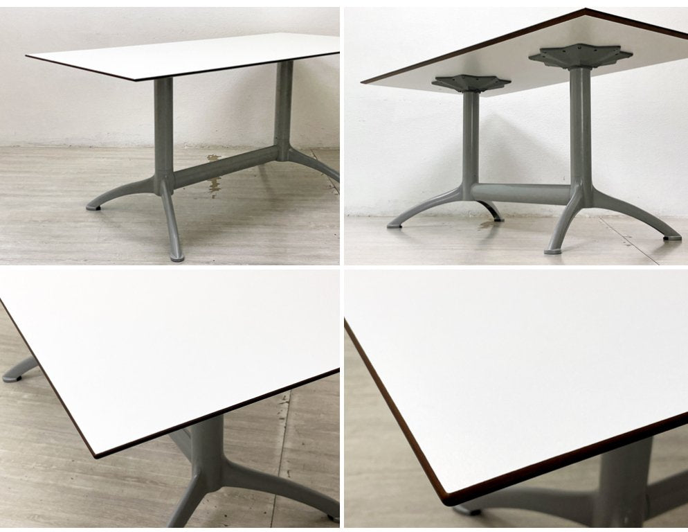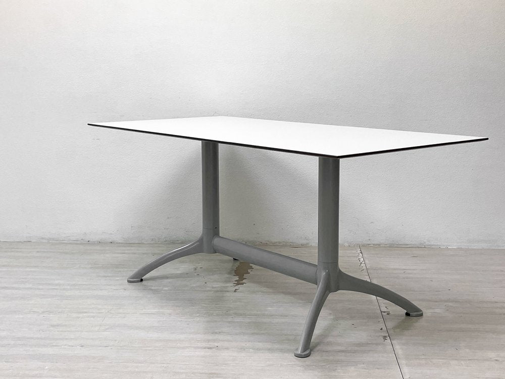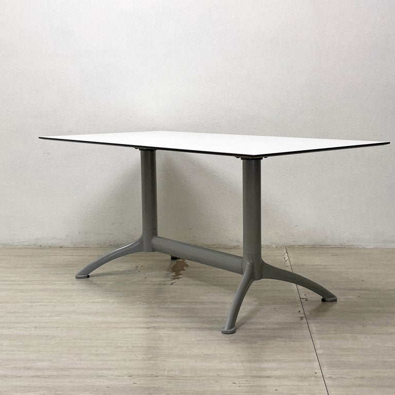 直線を基調にし、ホワイト色の天面にテーパーの施された側面で、清潔感と軽快な印象が同居した大型天板。天板表面は少し凹凸によるざらつきを表現した独特の手触りで完成されています。脚部はグレー色塗装のメタルフレームを使用しています。従来の4本脚テーブルのように天板四隅にレッグがある構造ではなく、天板中央に支柱がのびる造りなので、チェアは勿論、後ろに引く事の出来ないベンチ等の設置も可能。幕板の無い造りなので、肘掛け付きの椅子と合わせる場合も◎です!