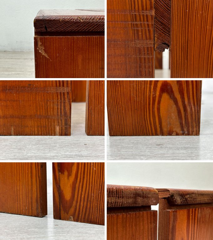 こちらはビンテージ品となります。経年に伴う擦れや小傷、ガリ傷や木部のひび割れや欠け、座面の一部にくすみ等が散見されますが、ビンテージの風合いとしてお楽しみくださいませ。また脚部のガタツキが見受けられますが、機能に影響があるような大きなダメージなどは特にございません。