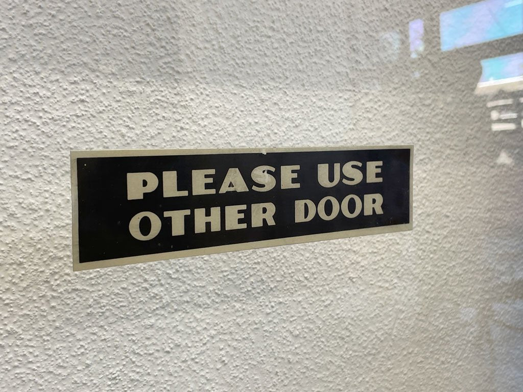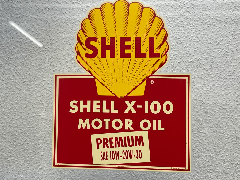 ビンテージのシェルオイルステッカーが目を惹く、古いショップドアとなります。