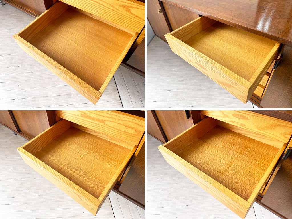 収納内部はオーク材を使用しており、棚板の高さ調整ができるオープンスペース、スライドレールの付いたファイリングドロワー、4杯の引き出しなど、様々な収納が備わっています。