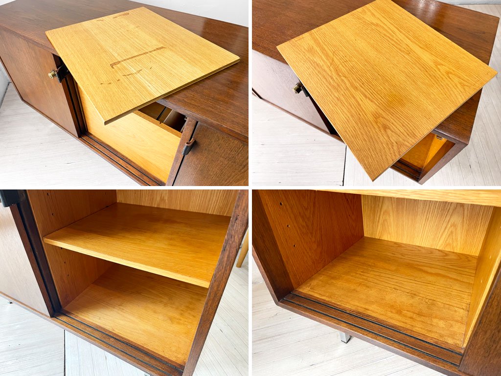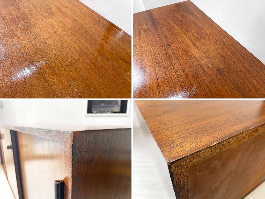 コチラのお品物はビンテージ品となります。使用・経年に伴う傷や擦れ、色ムラやペイントロス、シミや汚れ、突板の剥がれやくすみ、脚部のサビやくすみなどがございます。また、鍵穴は固着しており鍵の施錠は機能しておらず鍵も欠品しております。ビンテージ品となり経年なりの使用感はございますが、大きく美観を損なうようなダメージなども無く、サイドボートとしてのご使用に問題のある箇所などもございません。これからも安心してお使い頂けるコンディションを保っております。
