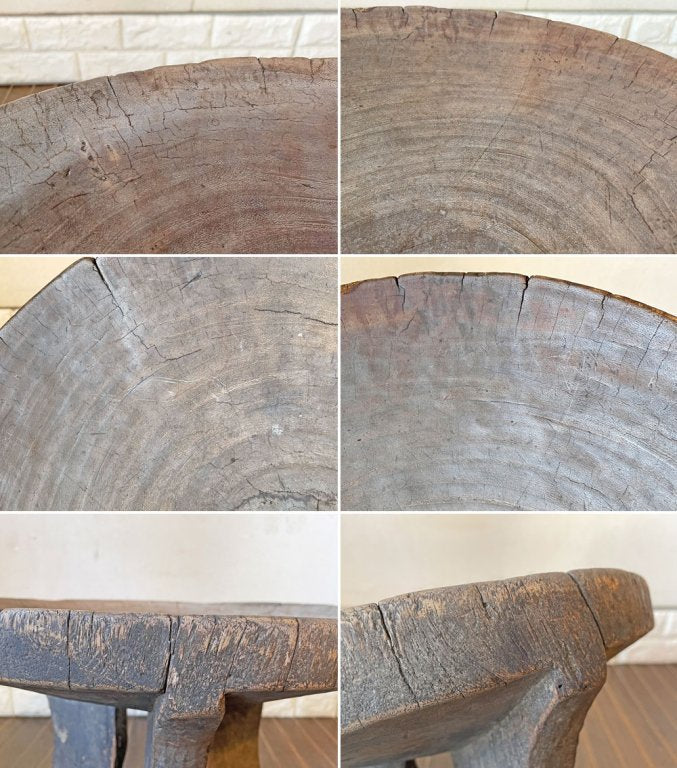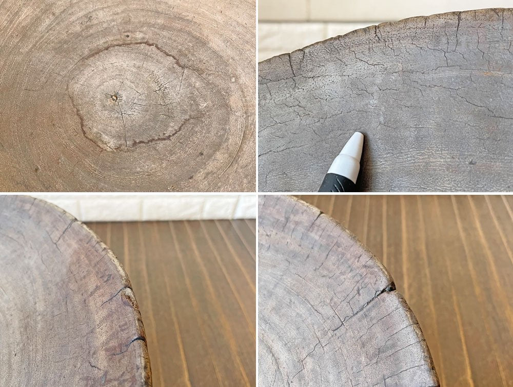 仕様に伴う擦れ傷のほか、スクラッチや染み、小さな欠け、一本の幹から彫り出しているため、木目に沿ったヒビが縁や脚部に見られますが、通常のご使用に問題となるものではございません。
