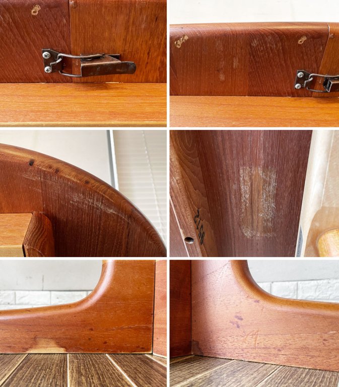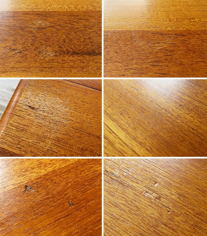 こちらは、ビンテージのお品物です。使用に伴う擦れや傷、打痕、輪染みなどの色落ちや塗料のような付着汚れなど、経年なりのダメージが散見されます。なお、脚部には底部に近い部分の縁の削れや木部の欠け、色ムラ等がございます。なお、前述の通り追加天板が欠品しているとともに、メイン天板も左右に開くことができません。また、若干のがたつきが生じる場合がございますので、市販の脚底フェルト等のご活用をお勧めいたします。通常のダイニングテーブルとしてのご使用に支障はございませんが、伸長不可のコンディションを加味したお求めやすい価格での販売となります。この機会にぜひご検討くださいませ。