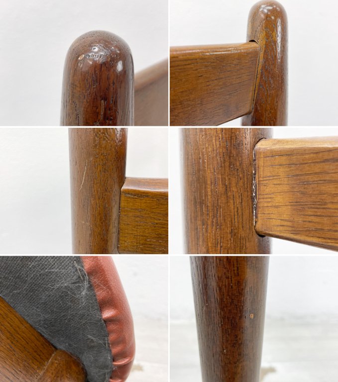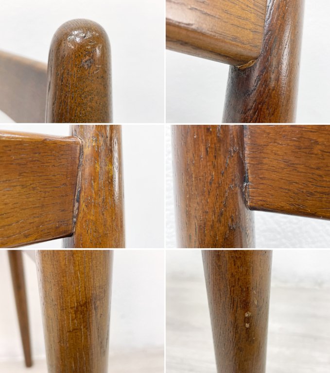 使用に伴う擦れや傷、打痕、色抜けが全体に散見され、座面裏側の不織布にはやや毛羽立ちが見られます。また背貫とフレームの間に僅かな隙間や、塗装の表面に軽微なヒビが確認できるものの、しっかり固定がされておりますので強度に問題はございません。これからも実用いただけるコンディションを保っております。