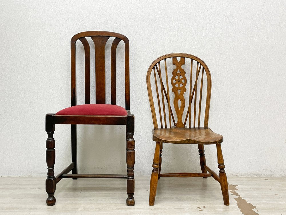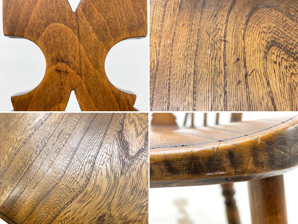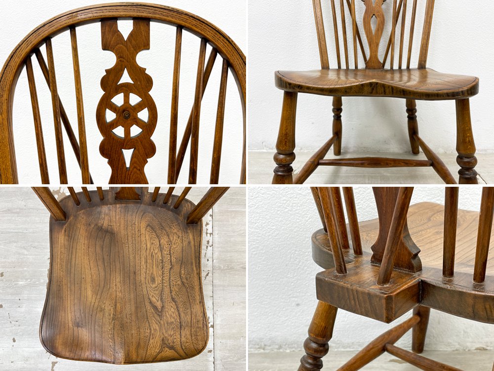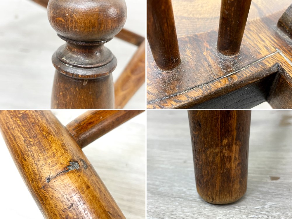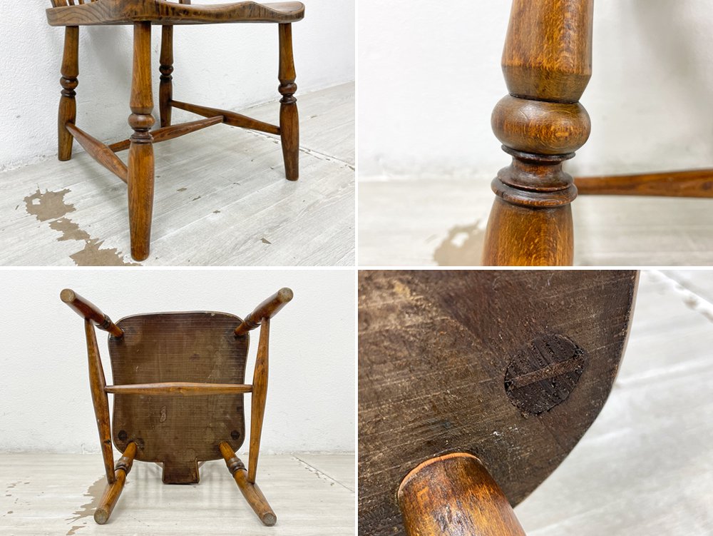 こちらのウィンザーチェアは、曲線が際立つ背もたれは伝統的なホイールバックの装飾が加えられ、美しく空間を演出。おそらく後年に脚部がカットされ座面高35cmに変更されておりますので、食卓との組み合わせよりも、リビング空間で使用するソファと合わせた使い方やキッズチェアとしてお使い頂けます。座面はお尻の形に合わせた座ぐり加工が施され、長時間の着座による身体への負担を軽減してくれます。
