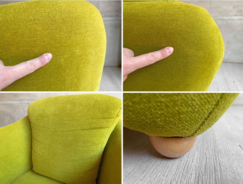 使用に伴い、ファブリック表面には微細な毛羽立ち、光の加減で確認できる薄い染み、背もたれ部分には若干のシワが見受けられます。木製の脚部には擦れ痕が確認できますが大きく目立つものではございません。その他著しいダメージは無く、USED品として概ね良好なコンディションを保っております。