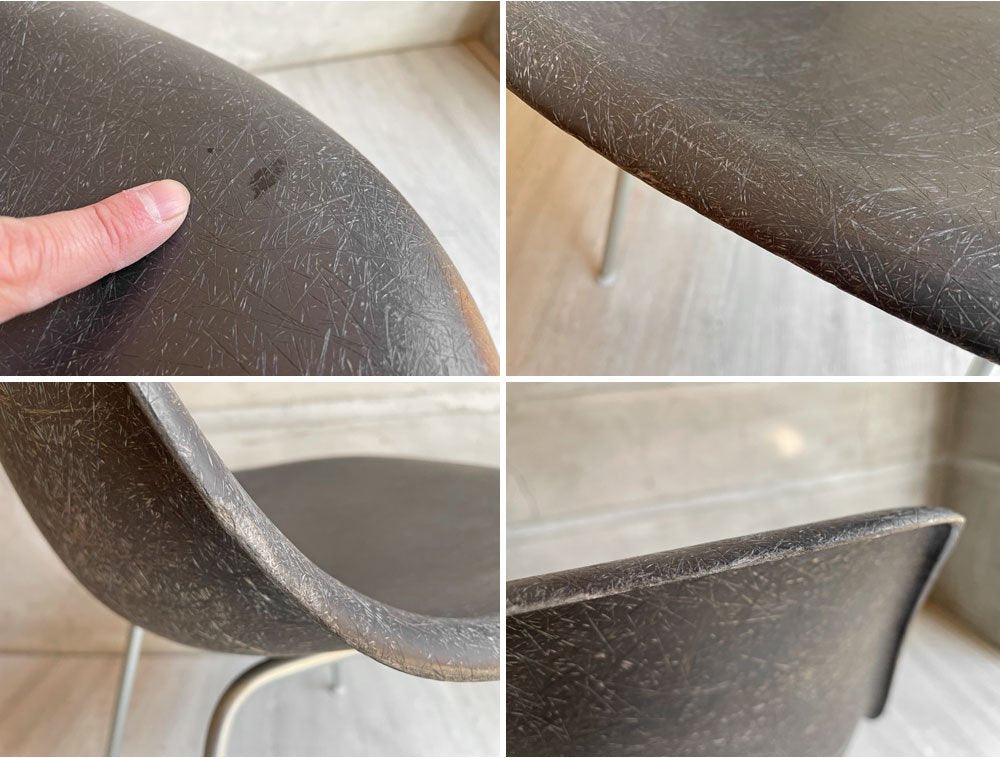 落ち着いたカラーリングで、ビンテージのシェルチェアの魅力であるたっぷりと使用されたファイバーが特徴。