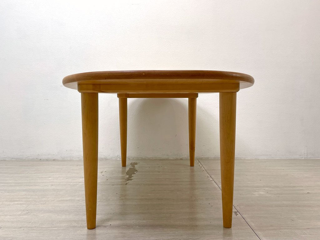 心地良いカーブを描く楕円天板は末席を作らず、使用人数に合わせてテーブルを囲めるように作られています。また曲線の柔らかさが、メイプル材の心地よい木肌や色合いと相俟って、自然と共に生活してると分かる安心感を与えてくれます。