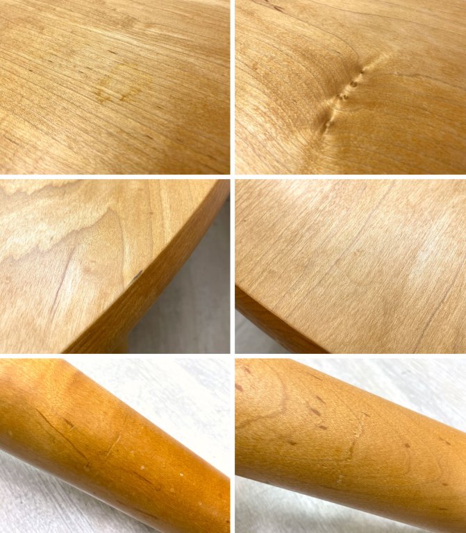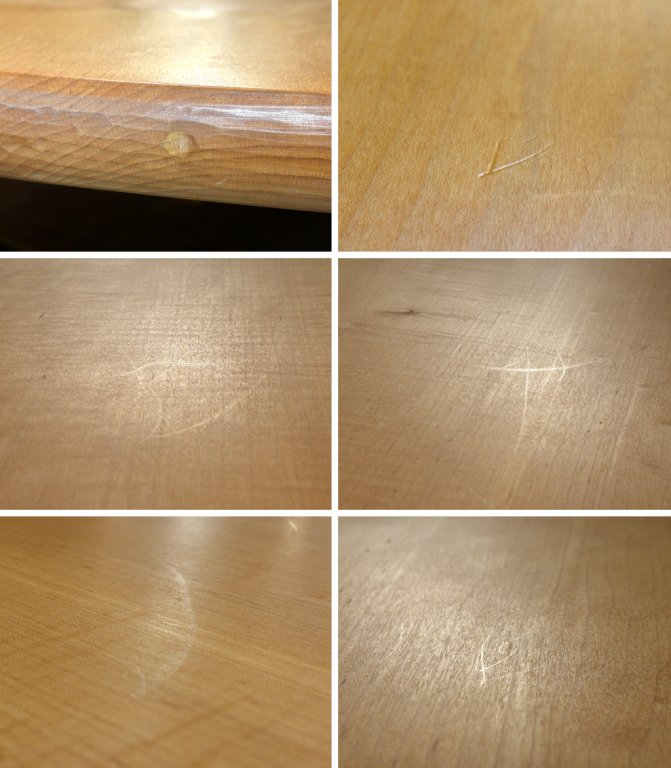 天板に軽微な染みが数箇所、また光加減で角度により見える擦れ傷が全体的にございます。脚部に線傷、打痕が散見されますが、著しく目立つ様なダメージは無く今後も十分実用頂けるコンディションを保っております。