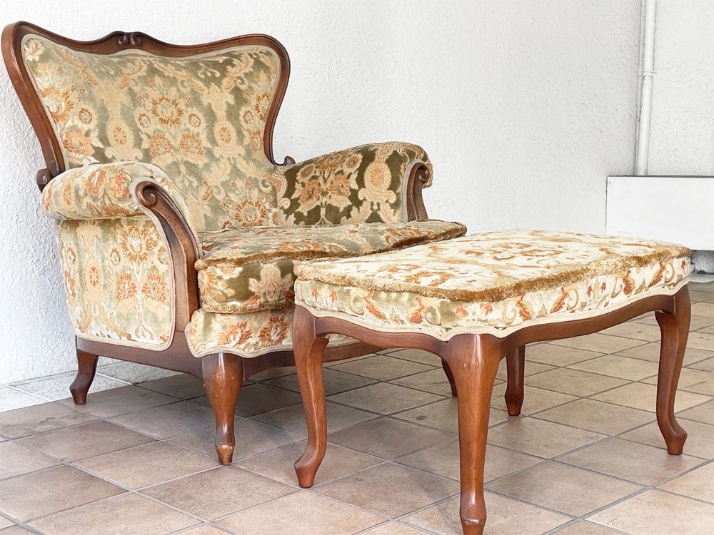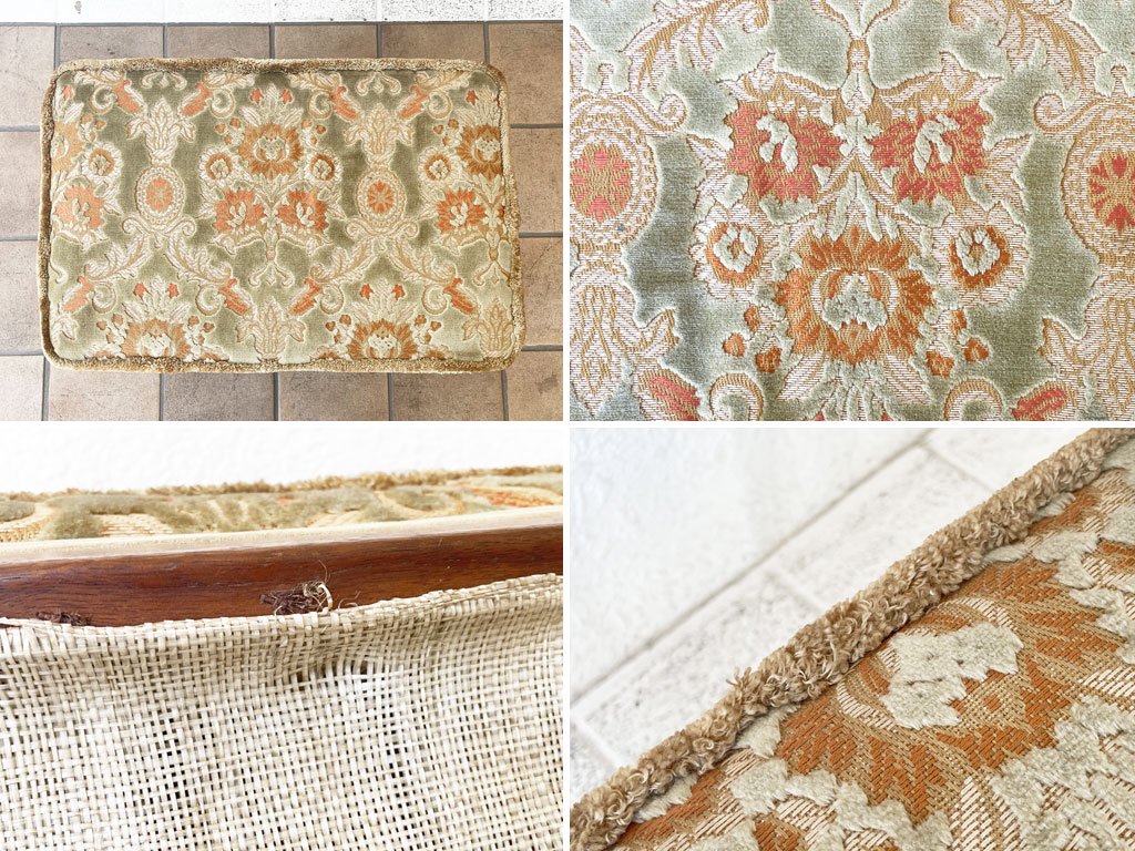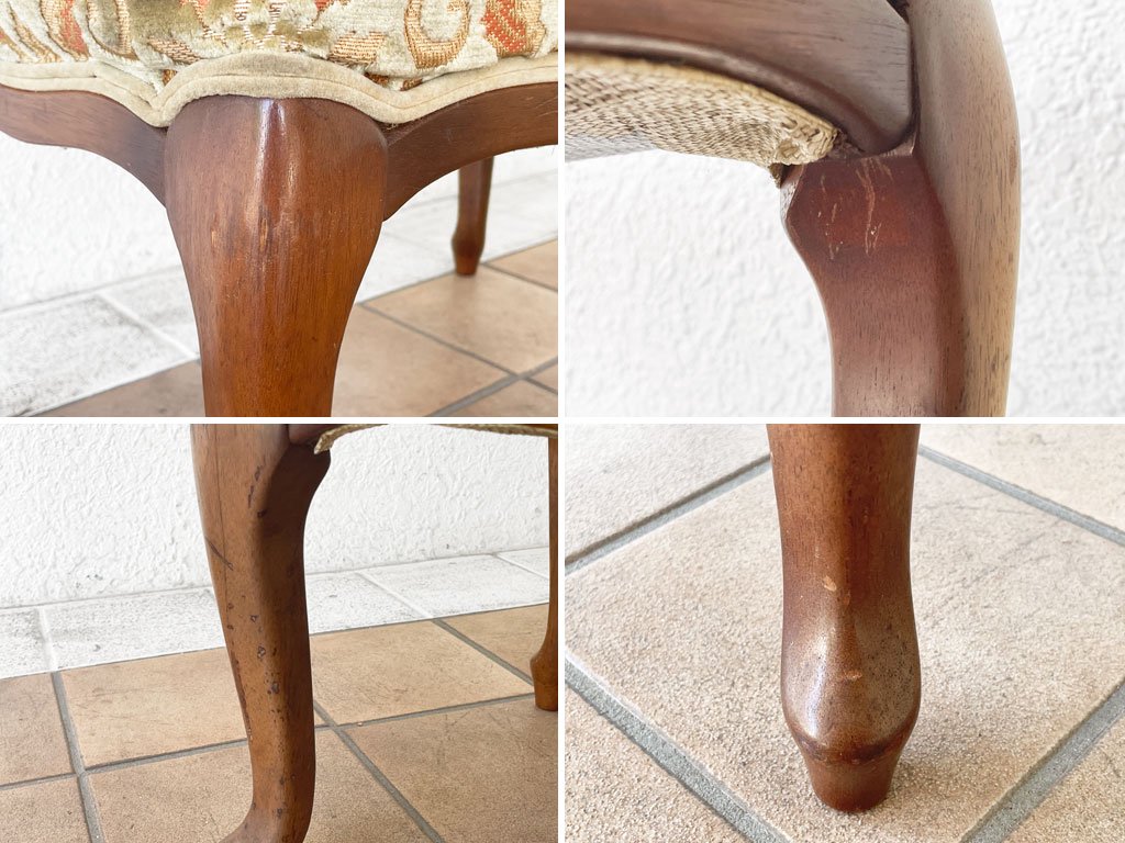 こちらはビンテージ品です。フレームには擦れ、打痕が散見されますが、大きく美観を損ねるものではございません。裏張りが張替えられている他、クッションにはややヘタリと型くずれがございますが着座やオットマンとしての実用に問題はなく、まだまだお使い頂けるコンディションを保っております。