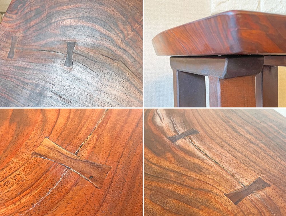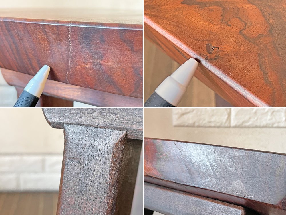 使用に伴う擦れ傷の他、細かな打痕、光の加減で感じられるムラなどはございますがいずれも大きく目立つものではございません。無垢材の特徴を生かしたアイテムのため、脚部と天板の隙間や木部表面のヒビなどは製造時からのものとなり、実用に問題となるものではございません。今後とも気持ち良くご使用頂けるUSED品として概ね良好なコンディションを保っております。