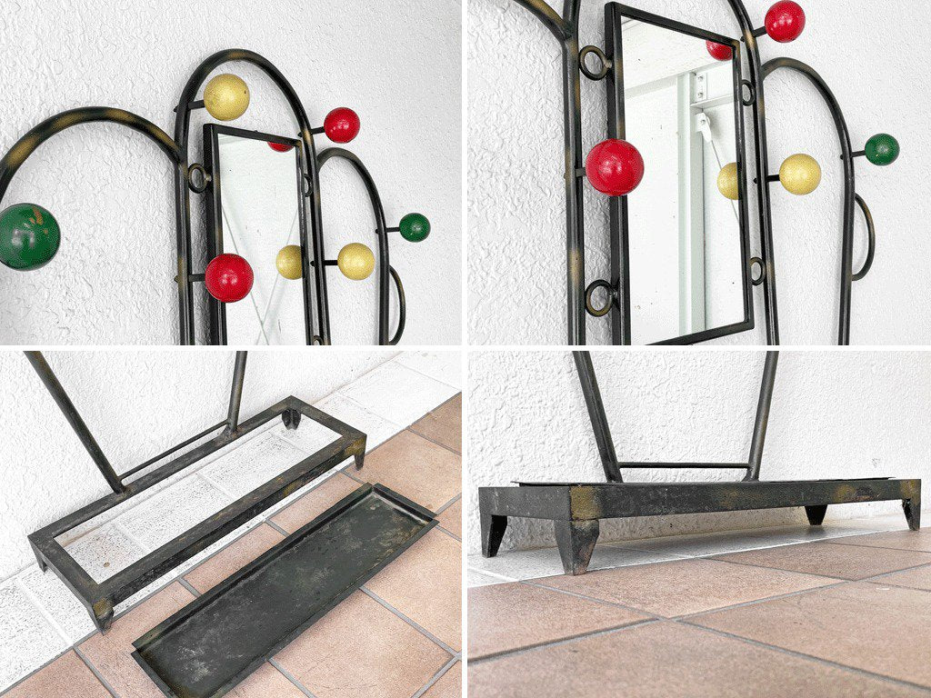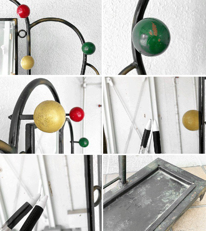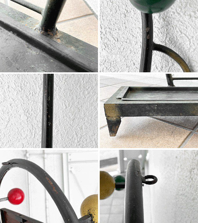 こちらはビンテージ品です。ペイントロス、錆や擦れ等経年なりのダメージが全体的に見られますが、味としてお楽しみ頂けます。また、形状上揺れがございます。フレーム上部の固定用ホールを使い、壁に固定してご使用くださいませ。その他使用上問題となるようなダメージも見受けられず、これからも安心してお使い頂けるコンディションを保っております。