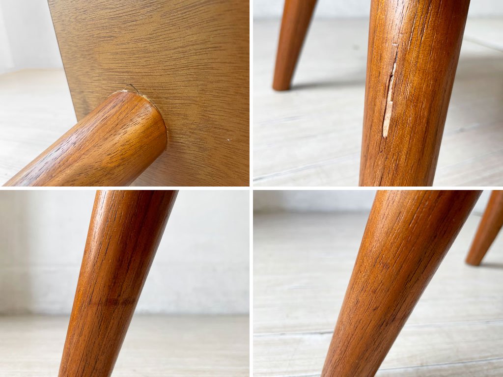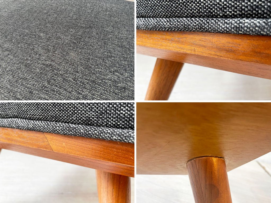 使用に伴い、ファブリックにスレ、フレームに傷や擦れ、突板の剥がれや色ムラが見受けられます。また、脚の付け根に僅かな隙間や突板の受けが見受けられますが、ガタつきやグラつきなどはございません。その他、クッションのヘタリなど使用に問題となるようなダメージも無く、これからも安心してご使用頂けるコンディションを保っております。