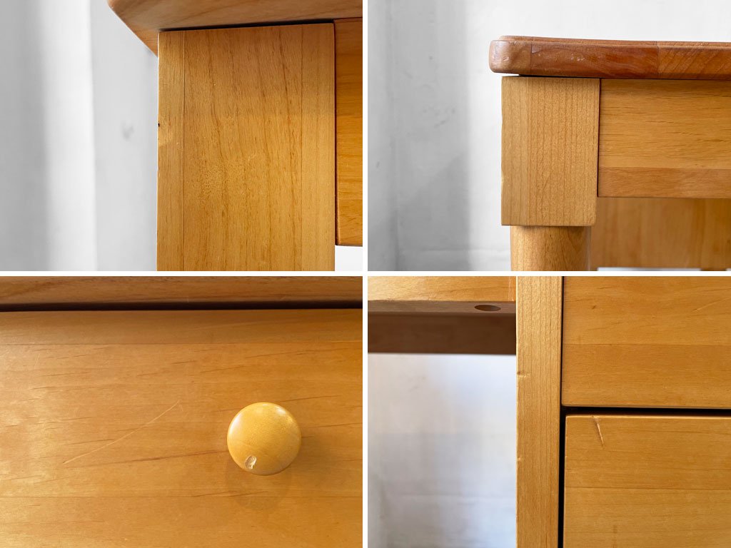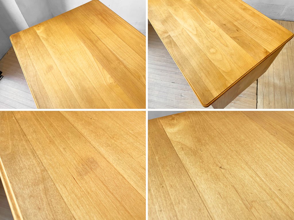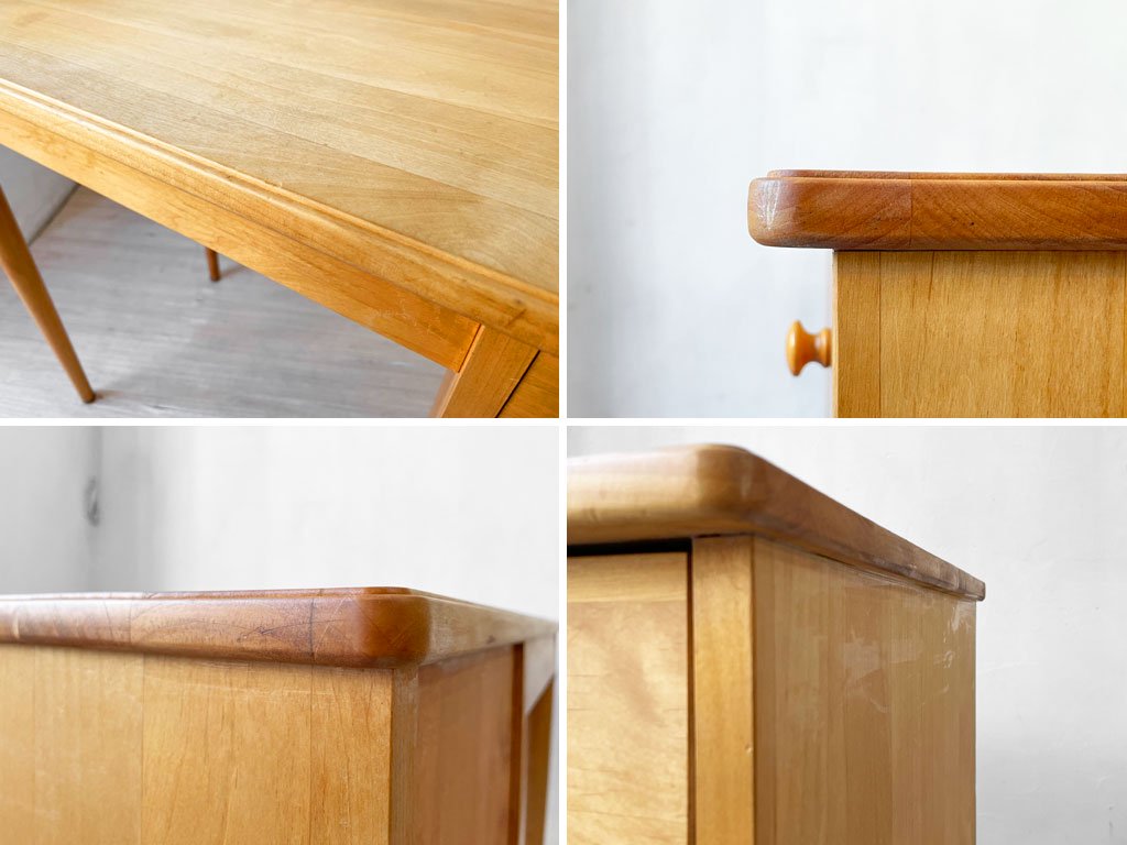 使用に伴い、傷や擦れ、打痕や色ムラ、シミや落としきれない汚れなどが散見されます。また、一部天板の僅かな沿りや接着痕などのダメージが見受けられます。多少の使用感はございますが、使用に問題となるような大きなダメージは無く、これからも永くご使用頂けるコンディションを保っております。