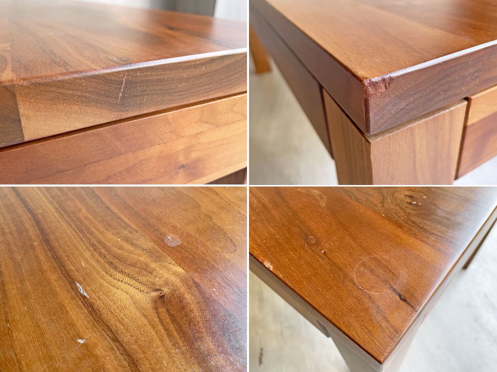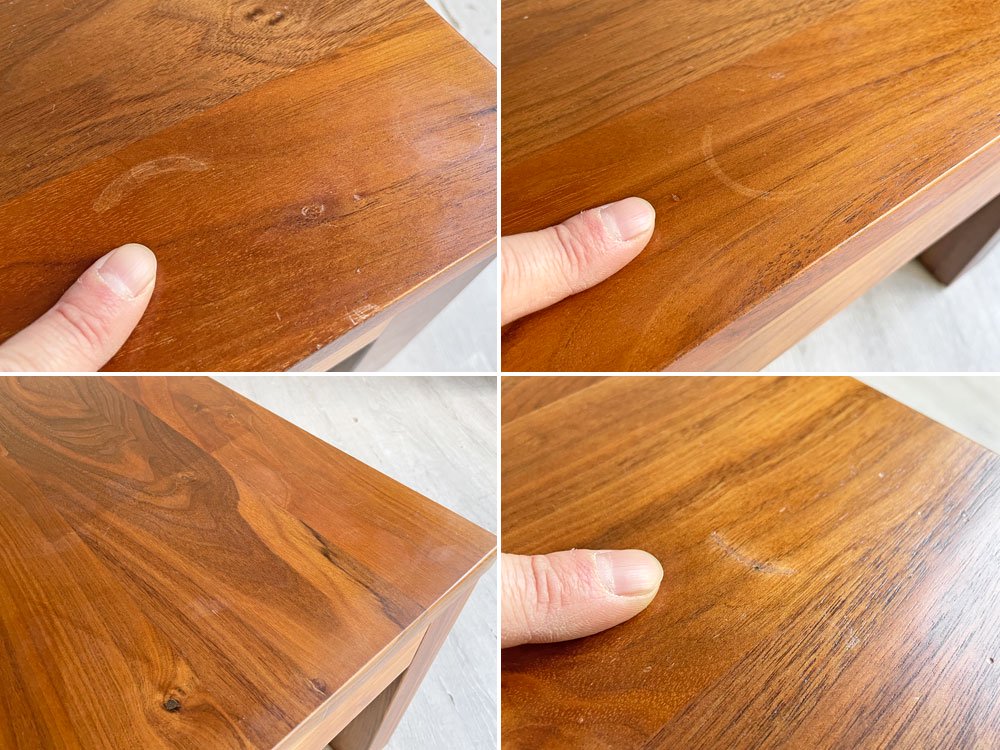 天板に複数の輪染みやコーティングの劣化、日焼けによる部分的な色褪せが見られます。そのほか打痕や擦り傷が散見され、実用は十分可能なものの、コンディションを考慮しお求めやすい価格でご提供いたします。