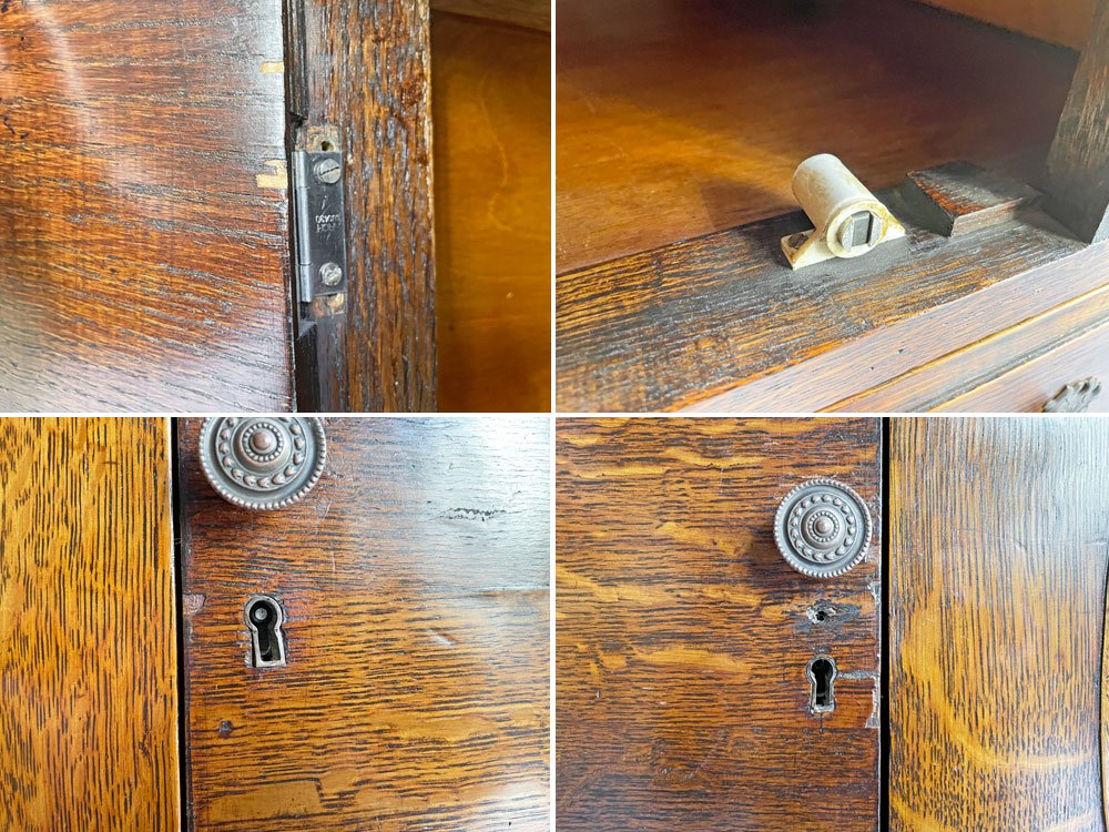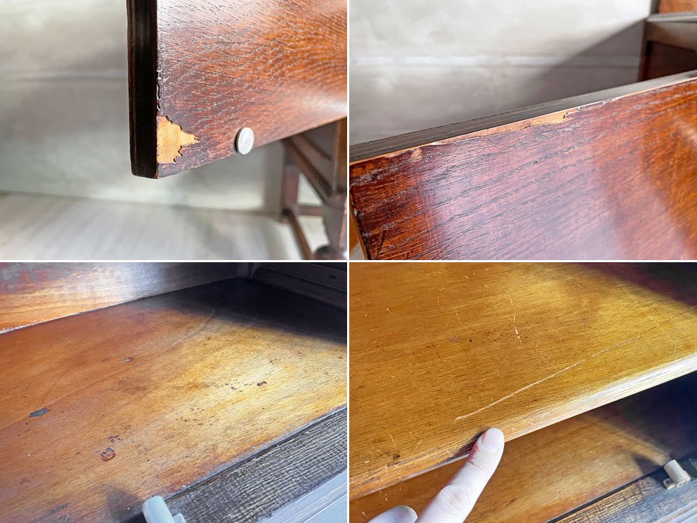 蝶番や扉受けパーツ、引き出しの底板が交換されており、修繕しながら使われ続けてきた実用的なビンテージ家具となります。