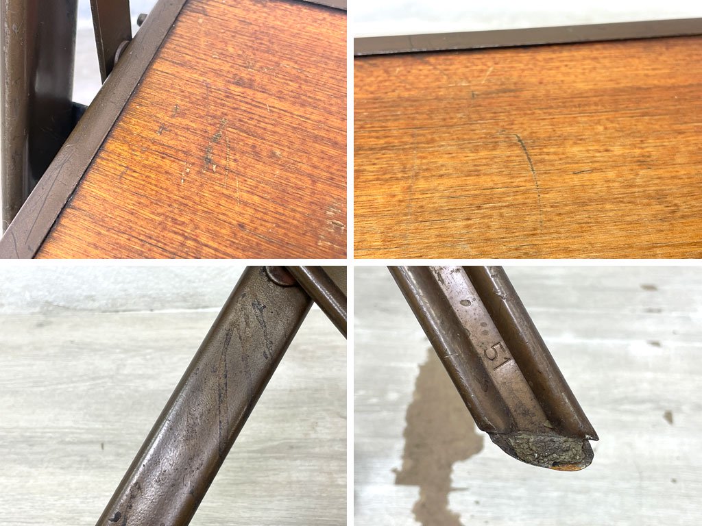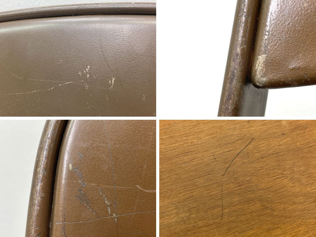 経年に伴う擦れや傷、線傷のほか、落としきれない汚れや錆が散見されます。また、座面には僅かな色落ちやレタッチ痕がございます。脚部にはガタツキがございますが、着座時は荷重によってある程度安定する為、大きく不自由は感じられません。これからもビンテージの風合いを楽しみながらご使用頂けるコンディションを保っております。