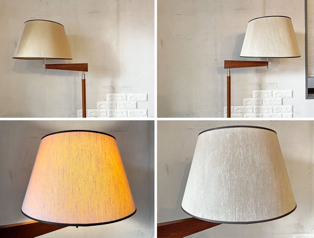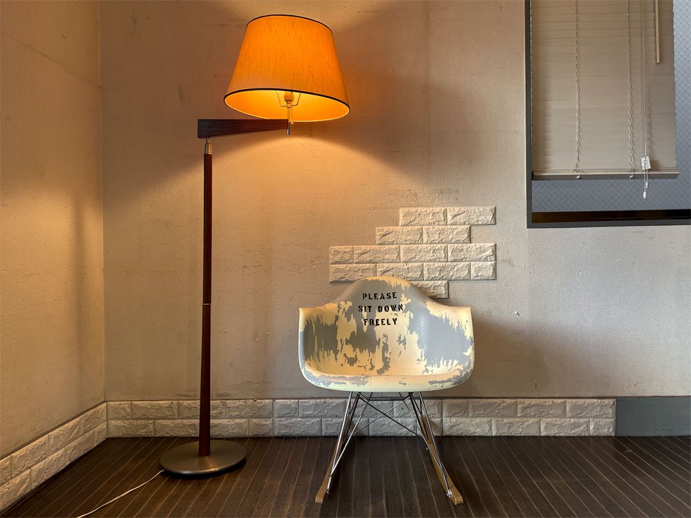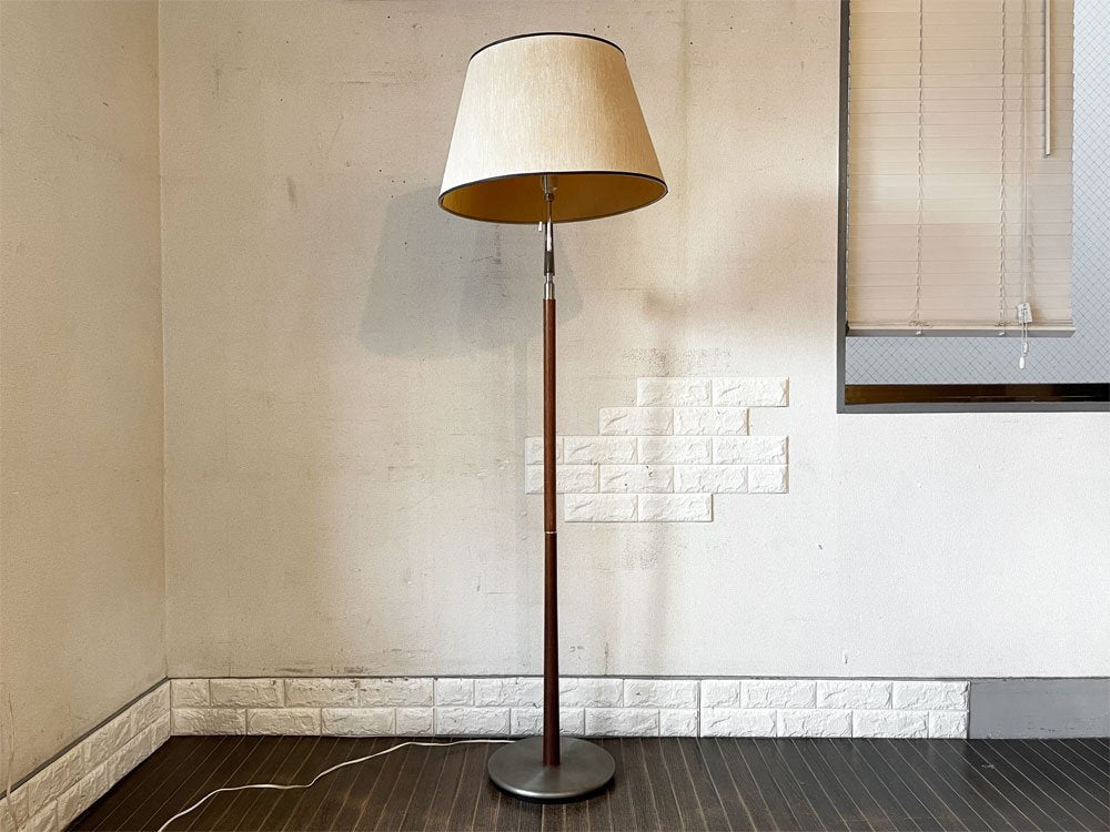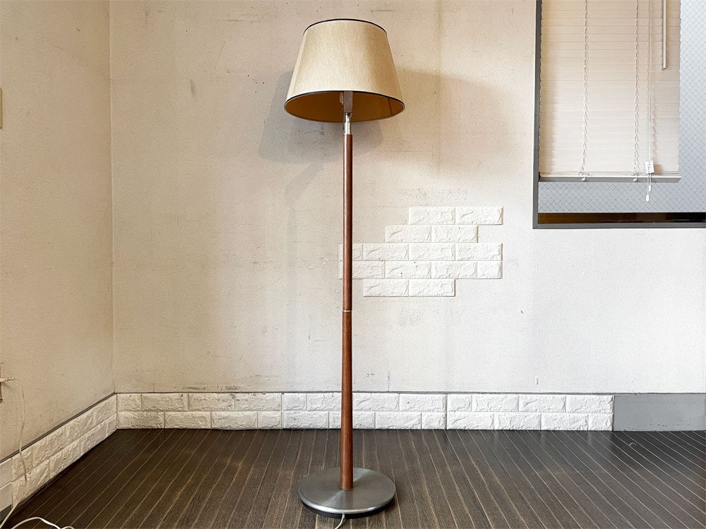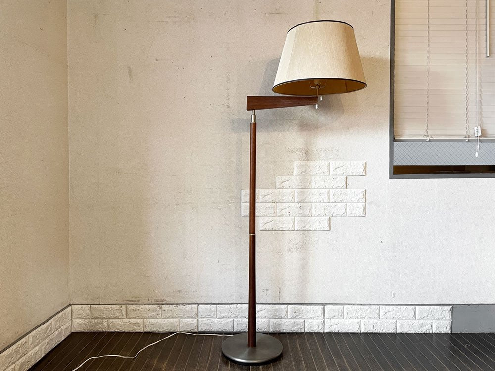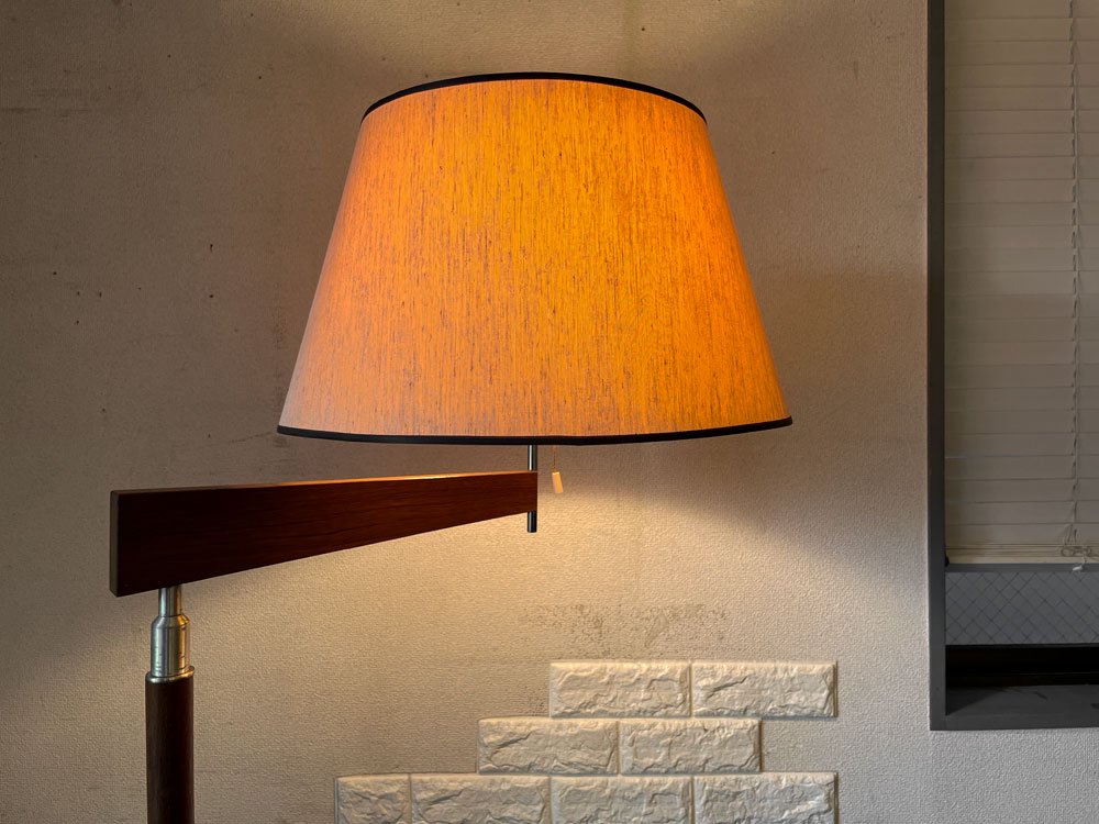 チーク材と布シェード、金属の異素材のコンビネーションにレトロな雰囲気が漂うビンテージのフロアランプです。
