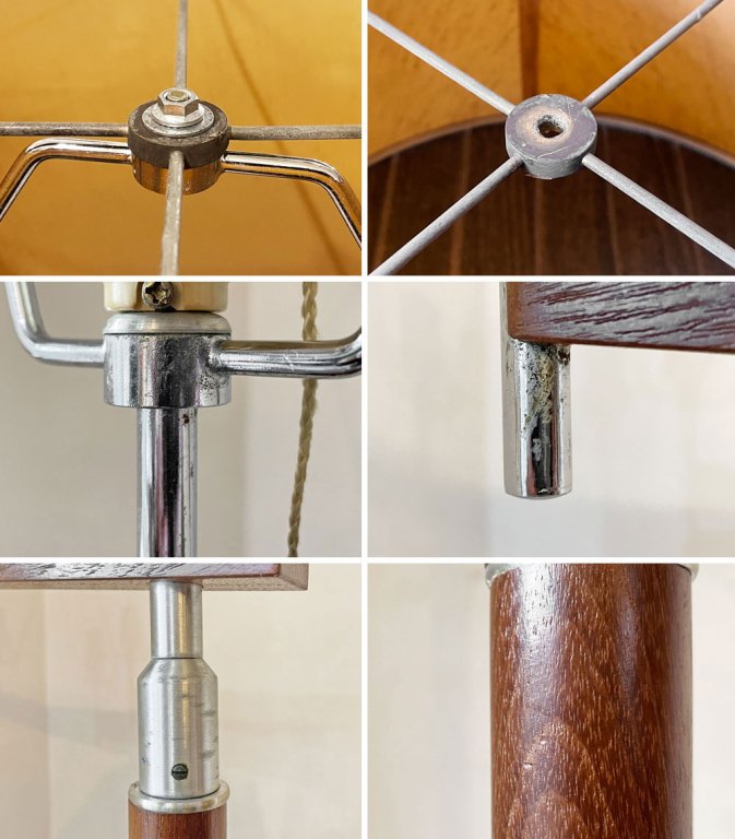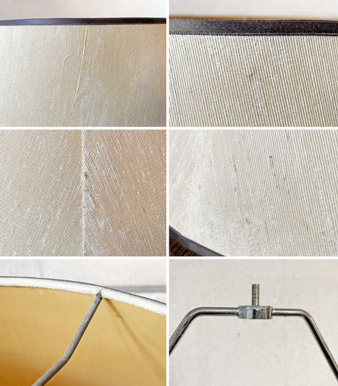 こちらは、ビンテージのお品物です。シェードには一部糸のほつれなどの生地の傷みが確認できるほか、シミ汚れが全体にございます。また、シェードを固定するパーツは代替品に取り替えられており、やや緩みが生じやすくなっていますがご使用には支障はございません。その他、チーク部分の小傷、金属部分のくすみや錆、コードの黒ずみ汚れが見受けられるとともに、全体に使用に伴う擦れや傷などの経年なりのダメージはございますが、風合いとしてお楽しみいただきながら実用頂けるコンディションを保っております。