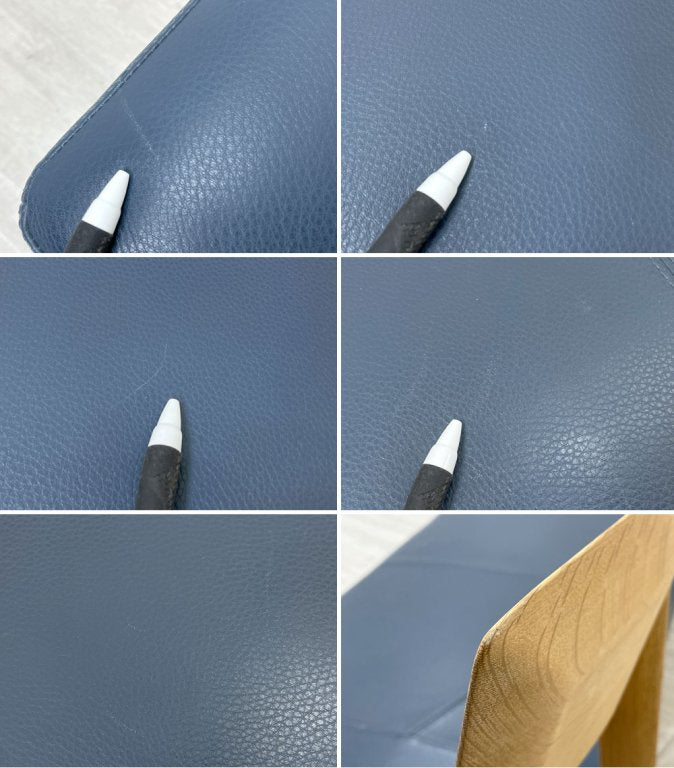 背もたれに光加減で見える軽微な擦れ、座面に線傷が複数箇所ございます。多少のダメージはあるものの、いずれも極端に目立つ様なものではなく、中古品としては概ね良好なコンディションを保っております。