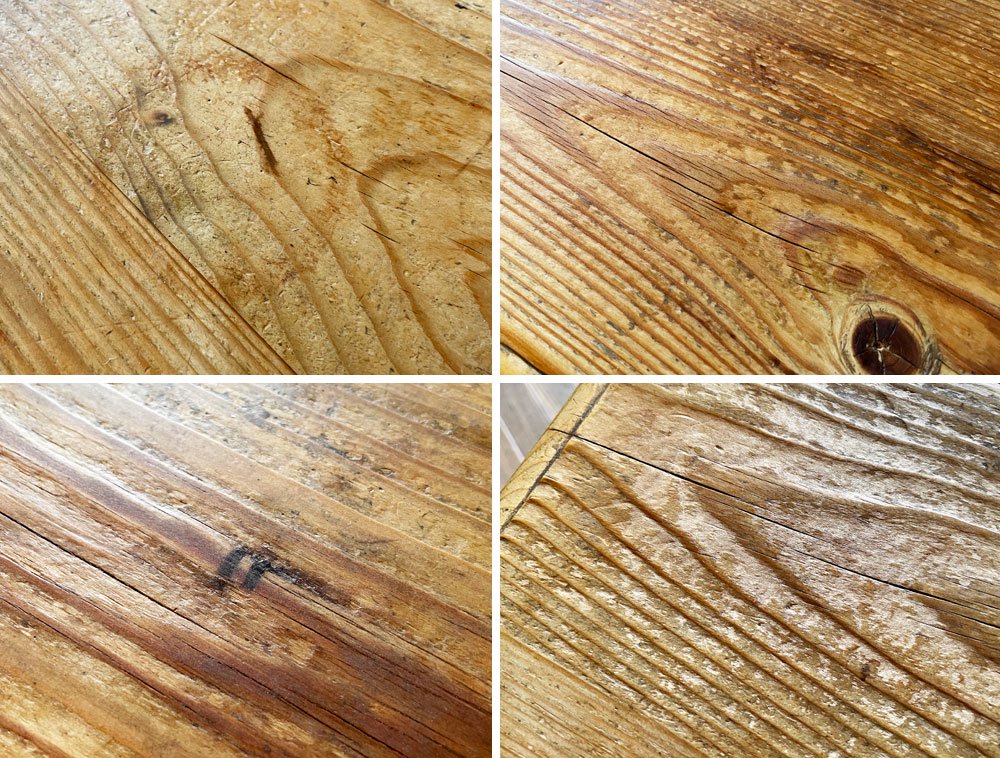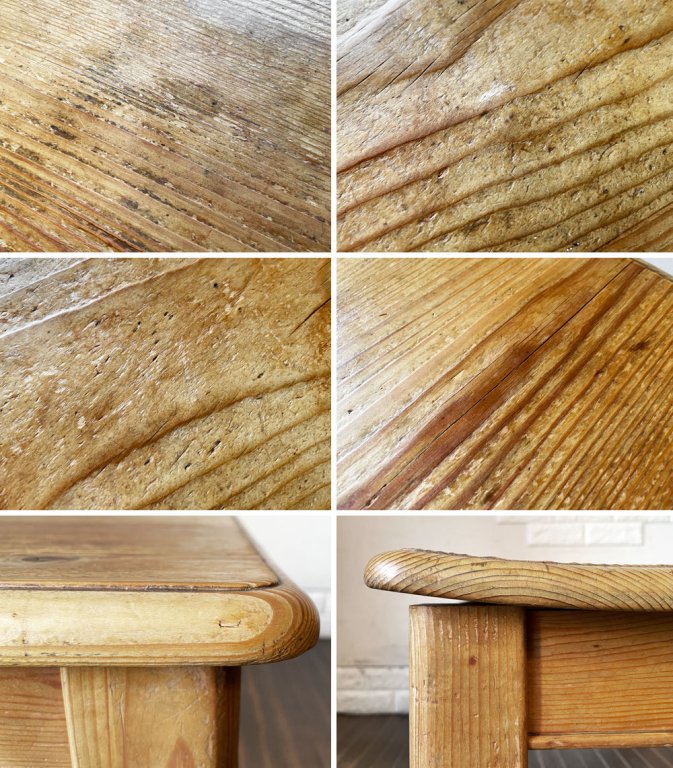 使用に伴い、全体に擦れや傷、打痕、縁の削れ、黒ずみなどの取り切れない汚れ等が散見されます。また、天板には輪ジミや色褪せ、反りなどが確認できますが、ご使用は問題なく行えます。ビンテージ家具のような風合いをお楽しみいただきながら実用頂けるコンディションを保っております。