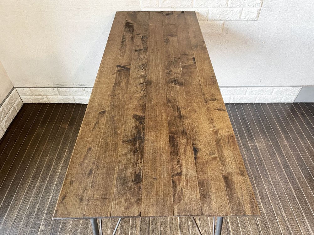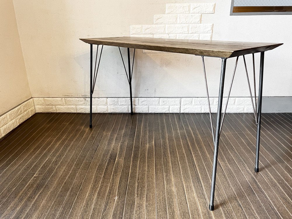 無垢集成材天板に鉄脚を合わせたデザインには、j.s.F(ジャーナルスタンダードファニチャー)やACME Furniture(アクメファニチャー)に通じる無骨さが漂います。
