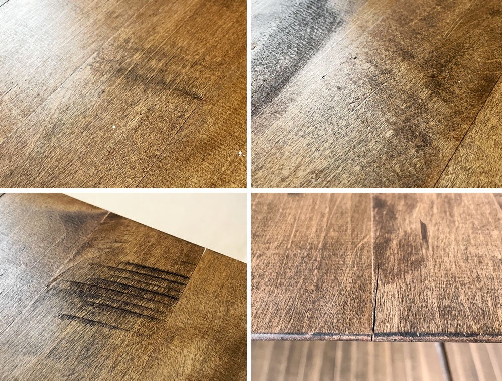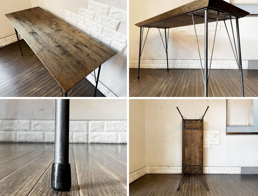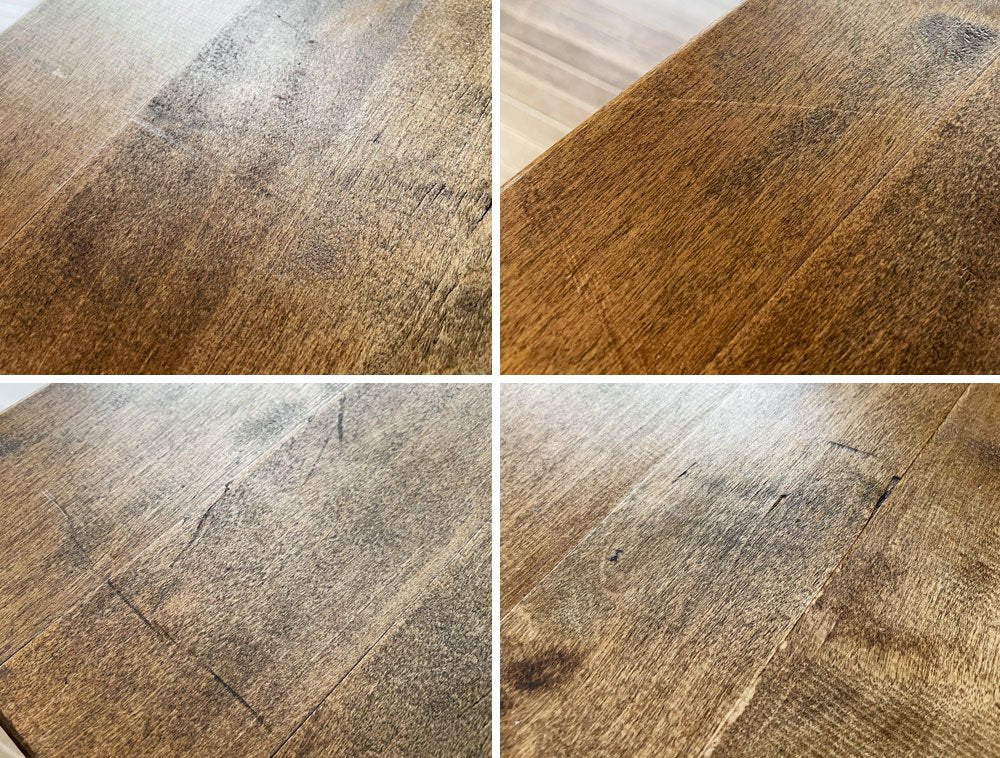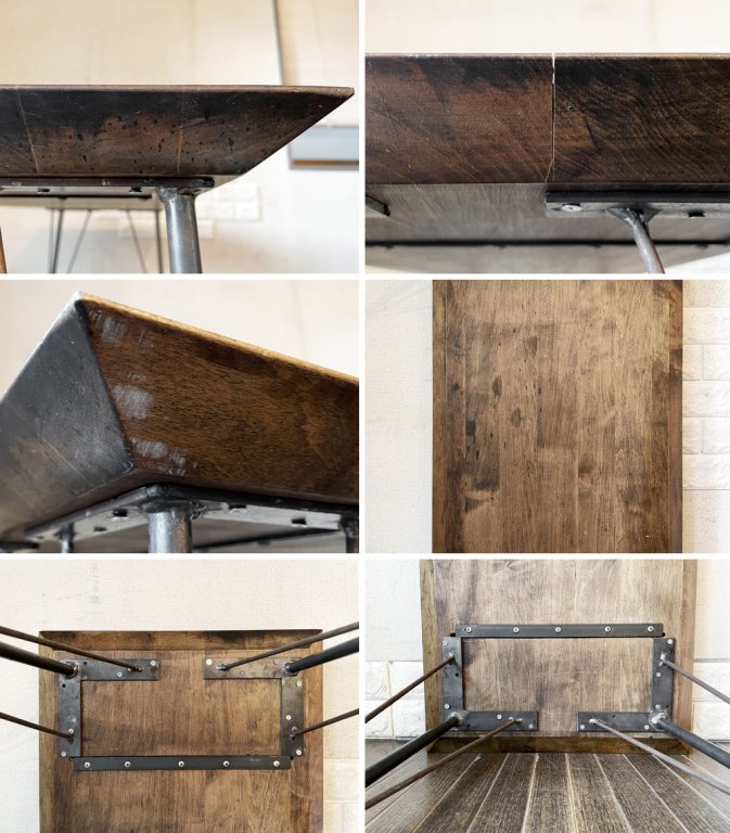 使用に伴う、擦れや傷、取り切れない汚れ等が全体にございます。また、天板には僅かな亀裂のほか、複数の線傷、白濁汚れや黒ずみなどが確認できるほか、脚部には表面塗装の剥がれやくすみ、錆、溶接痕が見受けられます。なお、天板と脚部を留めるビスがもともと数か所欠品しておりますが、現状がたつきやぐらつきといったダメージはございません。インダストリアルの風合いとしてお楽しみいただきながら実用頂けるコンディションを保っております。