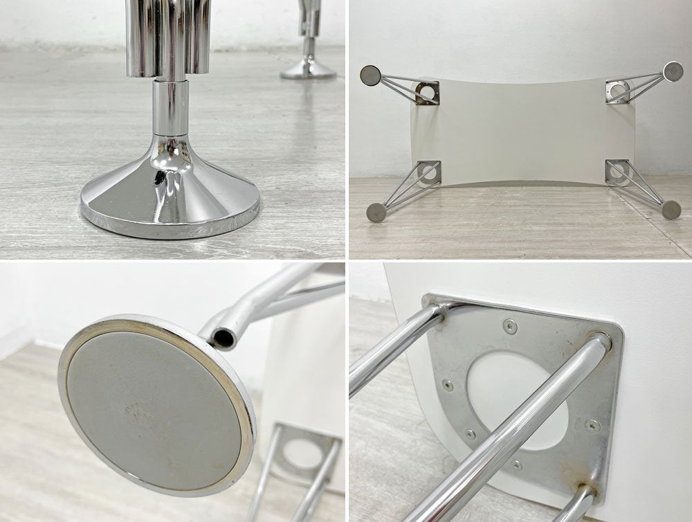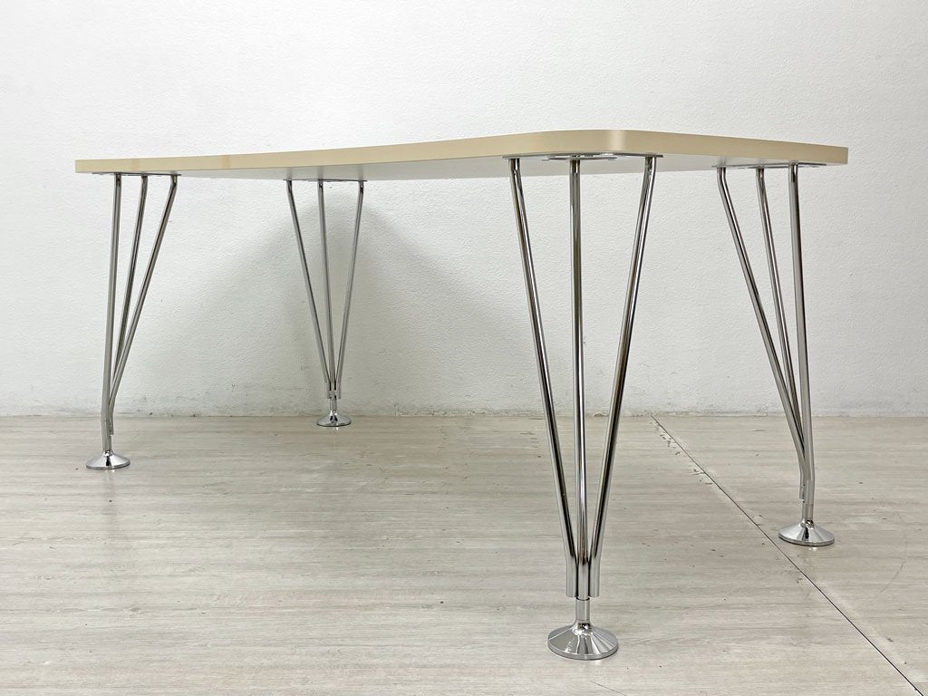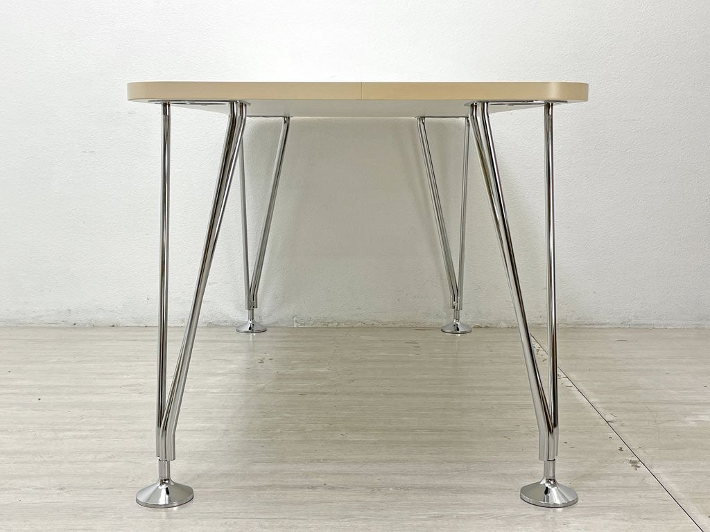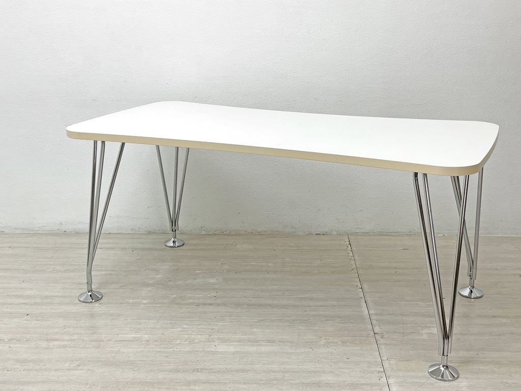 ホワイトラミネートトップにより、傷や汚れに強い素材で仕上げられ、ダイニングテーブルとしては勿論、ワークテーブルやオフィスの会議用テーブルとしても活躍出来るつくり。光沢のある軽量なクロームメッキスチールでできたレッグは、全体に程良いメリハリを加えています。